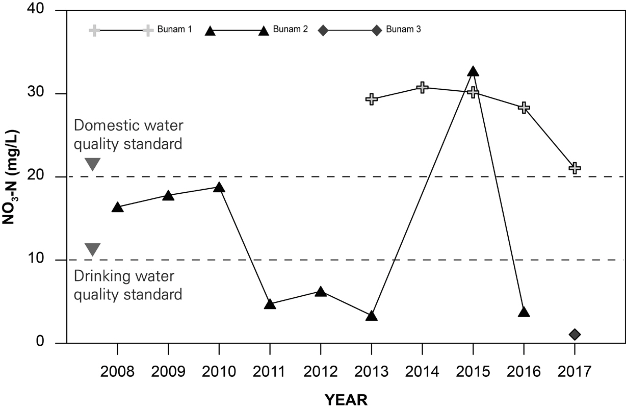 [방법 2]를 적용하여 지하수 수질이 3등급으로 평가된 부남방조제 표준유역에 대해 과거 10년(2008년~2017년)간의 측정망 자료를 이용하여 지하수 수질의 변화 특성에 대해 추가 분석을 수행하였다(Fig. 5). 부남방조제 표준유역에는 3개의 지하수수질측정망이 있는데, 2017년에는 Bunam 2의 자료가 부재하여 Bunam 1과 Bunam 3에서의 자료로 지하수 수질을 평가하였다. Bunam 1에서 질산성질소 평균 농도는 약 21.0 mg/L로 생활용수 수질기준을 초과하였으나, Bunam 3에서 약 2.0 mg/L로 먹는물 수질기준을 만족하여 두 지점의 평균으로 등급을 부여하는 [방법 1]을 적용하면 2등급으로 평가되나, [방법 2]를 적용하였을 때는 3등급으로 평가되었다. 한편, Bunam 1에서 2013~2017년 동안의 수질자료를 보면 지속적으로 생활용수 수질기준을 초과하는 것으로 볼 때 부남방조제 표준유역은 3등급으로 평가된 것이 적절하다고 볼 수 있다.
