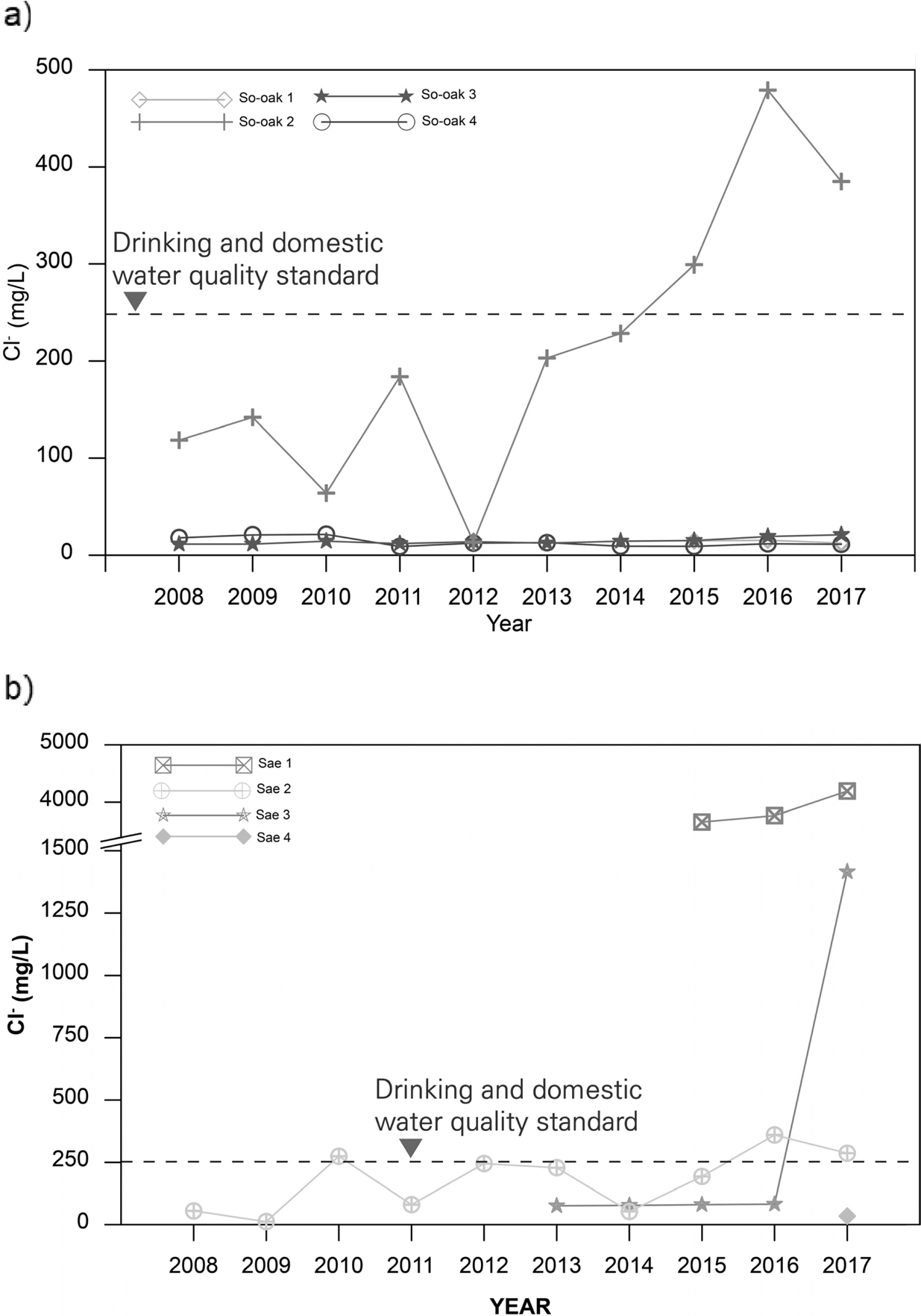 [방법 2]에서 3등급으로 평가된 소옥천 하류 표준유역과 새만금 방조제 표준유역에 대한 지하수 수질 특성을 자세하게 살펴보았다. 우선 대청댐 유역 내 위치한 소옥천 하류 표준유역은 [방법 1]에서는 1등급으로 평가된 표준유역이다. 여기에는 2017년 기준 4개소에서 수질 측정이 이루어졌다. 이 중 So-oak 2는 2010년과 2012년을 제외하고 매년 100 mg/L 이상 농도를 보이고 있으며 2015년부터 지속적으로 수질기준을 초과하고 있다. 반면, So-oak 2를 제외한 측정망에서는 먹는물 및 생활용수 수질기준인 250 mg/L를 초과하지 않았으며 비교적 낮은 농도를 유지하고 있는 것으로 나타났다(Fig. 7a). 이는 So-oak 2 주변에 지하수 수질저하의 원인이 있을 가능성이 있으므로 표준유역 내 오염원이 될 수 있는 곳을 파악하고 추후 관리 및 예방에 대한 대책수립 등 관리와 주의가 필요한 유역으로 판단할 수 있다.