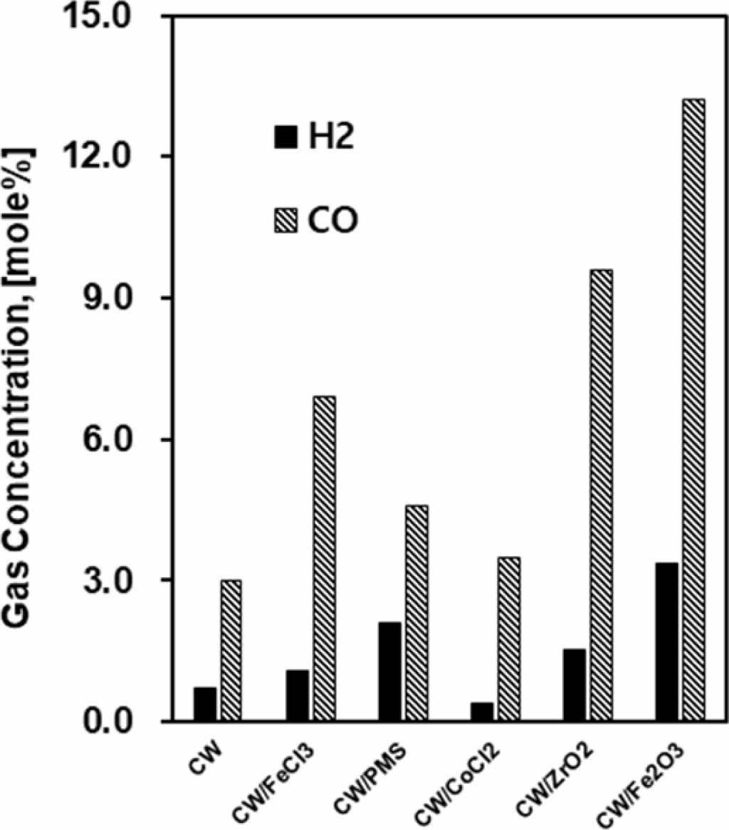 Fig. 2 Concentration profile of H2 and CO from thermochemical conversion of CW and CW/transition metal-based additives. |