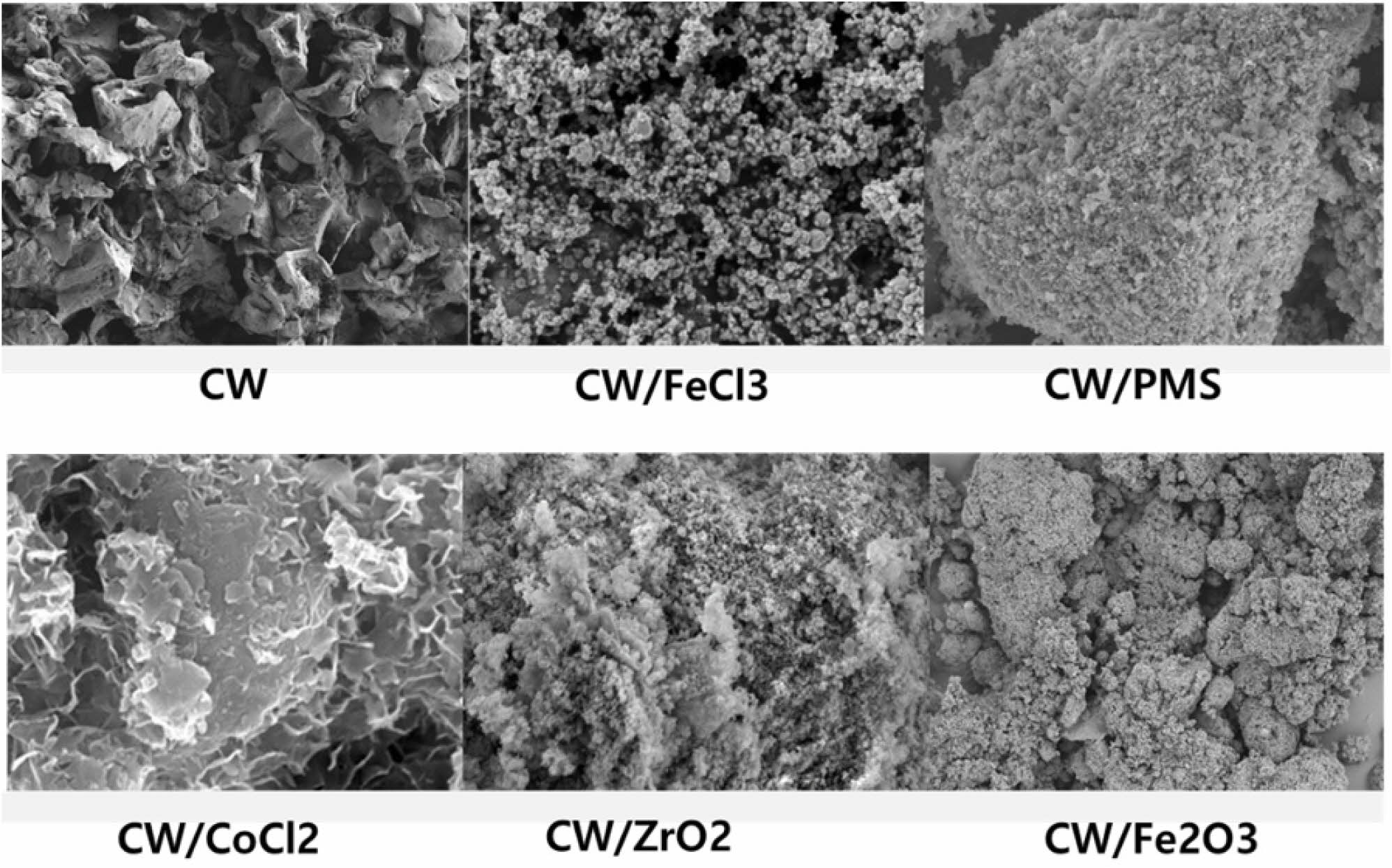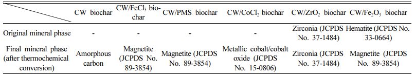 금속 바이오차들의 SEM 분석을 실시하였고, 분석 결과를 Fig. 3에 나타내었다. 첨가제가 없는 커피바이오차(CW biochar)는 뒤틀린 표면과 수십 마이크로 크기의 기공을 지닌 것으로 나타났는데 이는 선행 연구의 표면 형태 분석 결과와 일치한다(Cho et al., 2015). FeCl3 첨가제의 경우에는 열화학적 변환을 거쳐 바이오차 표면에 작은 입자의 산화물들이 형성된 것을 확인할 수 있었으며, Fe 함유 제지 슬러지 PMS가 첨가된 경우에는 커피 바이오차와 함께 덩어리 형태(aggregate)를 띄는 것으로 나타났다. 코발트(CoCl2·H2O)와 지르코늄(ZrO2)의 경우에는 날카롭고 뾰족한 표면을 가진 광물 입자들이 바이오차 표면에 분산되어 있는 것으로 관찰되었으며, 철 산화물(α-Fe2O3)의 경우에는 상당히 입자들이 응집된 형태를 보였다.