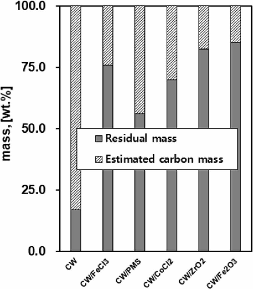 Fig. 4 Mass weights (residual mass & estimated carbon mass, wt.%) of solid products after TGA analysis (final temperature = 900oC, air condition). |