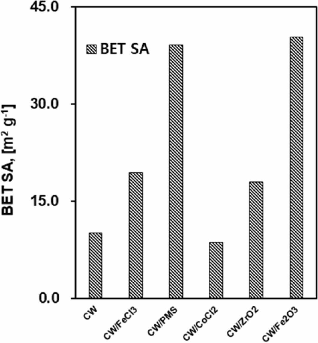 금속 바이오차 표면적을 분석하기 위해 BET 분석을 실시 하였고, 분석 결과는 Fig. 5와 같이 나타내었다. 분석 결과, 커피바이오차 CW는 비교적 낮은 약 10 m2/g의 BET 표면적을 갖는 것으로 관찰되었다. 선행 연구에서 이산화탄소 환경에서 제조한 마이크로 기공(micropores)을 다수 지닌 바이오차들에 비해 낮은 수치(100 m2/g 이상)인 것으로 보아 해당 물질에는 마이크로 기공이 생성되지 않은 것으로 추정된다. 첨가제가 있는 경우 제조된 금속 바이오차들은 대부분 커피바이오차보다 높은 표면적을 지니는 것으로 나타났다. 이는 열화학적 반응으로 생성된 광물들이 바이오차 표면에 기공을 생성시킨 것에 기인하는 것으로 사료된다(Cho et al., 2017). 그러나 코발트의 경우에는 타 전이금속들에 비해 표면적을 높이지 못했고, 철 함유 제지 슬러지 PMS(약 42 m2/g)와 α-Fe2O3(약 43 m2/g) 첨가된 경우에만 상당한 표면적 증가를 이끌어 냈다. 이는 바이오차 표면에 기공을 생성시키는 데 철 광물이 효과적이라는 것을 암시한다.