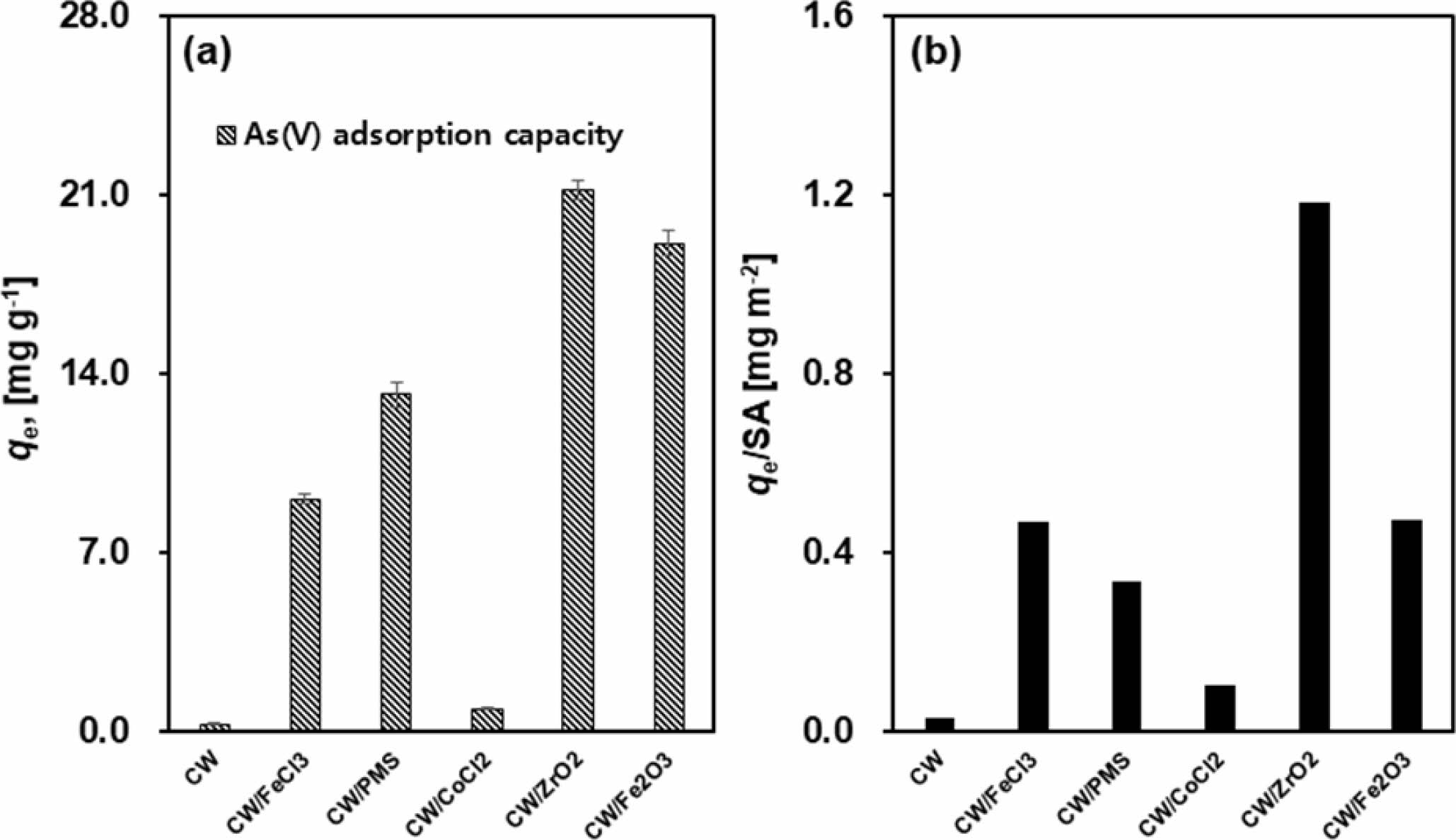 금속 바이오차들의 음이온성 금속 오염물질에 대한 흡착 능력을 비교하기 위해 5가 비소의 흡착 효율을 비교하였다. 비교 방법은 1 g/L 금속 바이오차와 고농도의 100 mg/L As(V)를 pH 5 조건에서 24시간 반응시킨 후 금속 바이오차 1 g 당 제거된 As(V) 양(mg)을 계산하였으며, 비소 흡착량 qe(mg/g)으로 표현하였다.