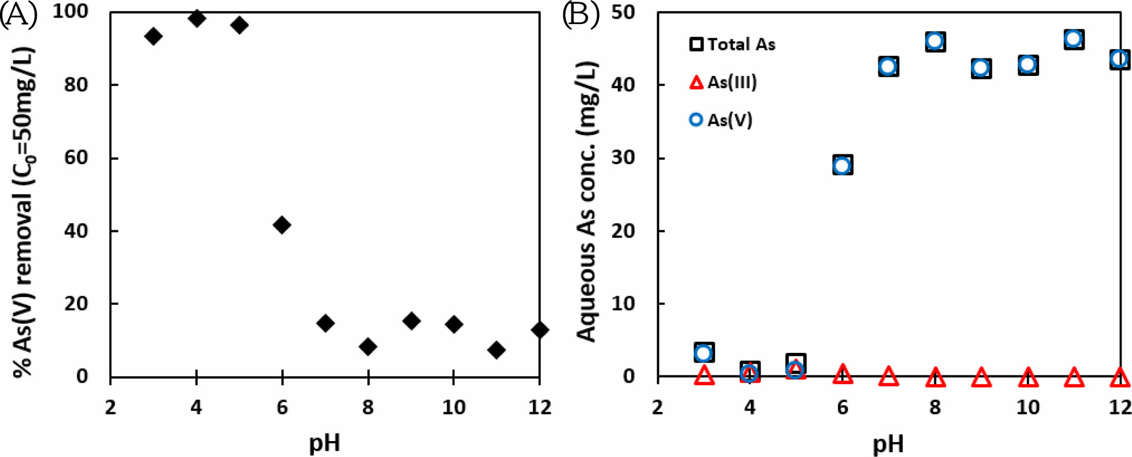 모든 배치실험은 산소가 제거된 초순수를 이용하여 혐기성 글러브박스 내부에서 수행하였으며, 산소와의 접촉은 실험의 모든 과정에서 철저하게 배제되었다. As(V) stock solution은 HAsNa2O47H2O(sodium arsenate dibasic heptahydrate) 10,000 mg As/L의 농도로 제조하여 목적하는 농도로 희석하여 사용하였다. As(V)의 pH 조건별 FeS에 의한 제거효율을 알아보기 위해, pH 3에서 12 사이로 pH를 조정한 1 g/L FeS의 용액에 As(V)의 비소 stock solution을 50 mg As/L의 농도가 되도록 투입하여 반응시켰다. 준비된 시료는 수직교반기을 이용하여 3일(72시간) 반응시켰다. 3일간 반응된 시료의 반을 0.1 μm 나일론 필터를 사용하여 여과하고 묽은 HNO3 용액을 이용하여 희석한 후 Inductively coupled plasma-optical emission spectrometer(ICP-OES, Ultima 2, Horiba)를 사용하여 총 비소의 농도를 측정하였다. 나머지 반절의 시료는 용액상 비소의 화학종을 분석하는 데 사용하였는데, 화학종 분석은 Bond Elut C18 카트리지(Agilent Tech- nology)를 사용하여 As(III)와 As(V)의 농도를 분리하여 측정하였다. Bond Elut C18 카트리지는 메탄올 2 mL, 물 2 mL를 사용하여 전처리하였다. 적당량의 측정 샘플과 1% Ammonium pyrrolidine dithiocarbamate 1 mL 용액을 넣고 pH 5.5 acetate buffer 용액을 희석액으로 하여 혼합한 샘플용액을 카트리지를 통과시키면 무극성의 As(III)는 카트리지에 남고, 극성인 As(V)는 통과하는 기작으로 As(III)와 As(V)를 분리한다. 카트리지를 통과한 As(V) 용액의 농도를 ICP-OES를 사용하여 측정한 뒤, 앞서 분석한 총 농도에서 측정된 As(V)이 농도를 차감하여 As(III)의 농도를 계산하였다.