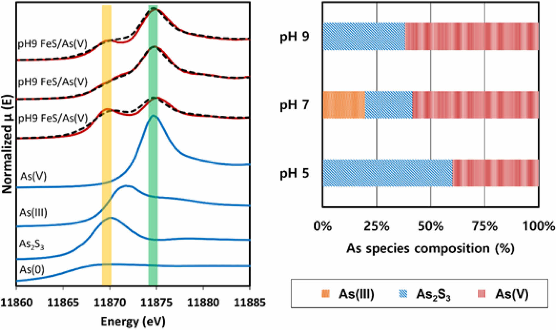 Mackinawite (FeS), as a ubiquitous reduced iron mineral, is known as a key controller of redox reactions in anaerobic subsurface environment. The reaction of FeS with redox-sensitive toxic element such as arsenic is substantially affected by pH conditions of the given environments. In this study, the interaction of As(V) with FeS was studied under strict anaerobic conditions with various pH conditions. The pH-dependent arsenic removal tests were conducted under wide ranges of pH conditions and X-ray absorption spectroscopy (XAS) was applied to investigate the reaction mechanisms under pH 5, 7, and 9. The removal efficiency of FeS for As(V) showed the higher removal of As(V) under low pH conditions and its removal efficiency decreased with increasing pH, and no As(V) reduction was observed in 1 g/L FeS solution. However, XAS analysis indicated the reduction of As(V) to As(III) occurred during reaction between FeS and As(V). The reduced form of As(III) was particularly identified as an arsenic sulfide mineral (As2S3) in all pH conditions (pH 5, 7, and 9). As2S3 precipitation was more pronounced in pH 5 where the solubility of FeS is higher than in other pH conditions. The linear combination fitting results of XAS demonstrated that As(V) removal mechanism is concerted processes of As2S3 precipitation and surface complexation of both arsenic species..