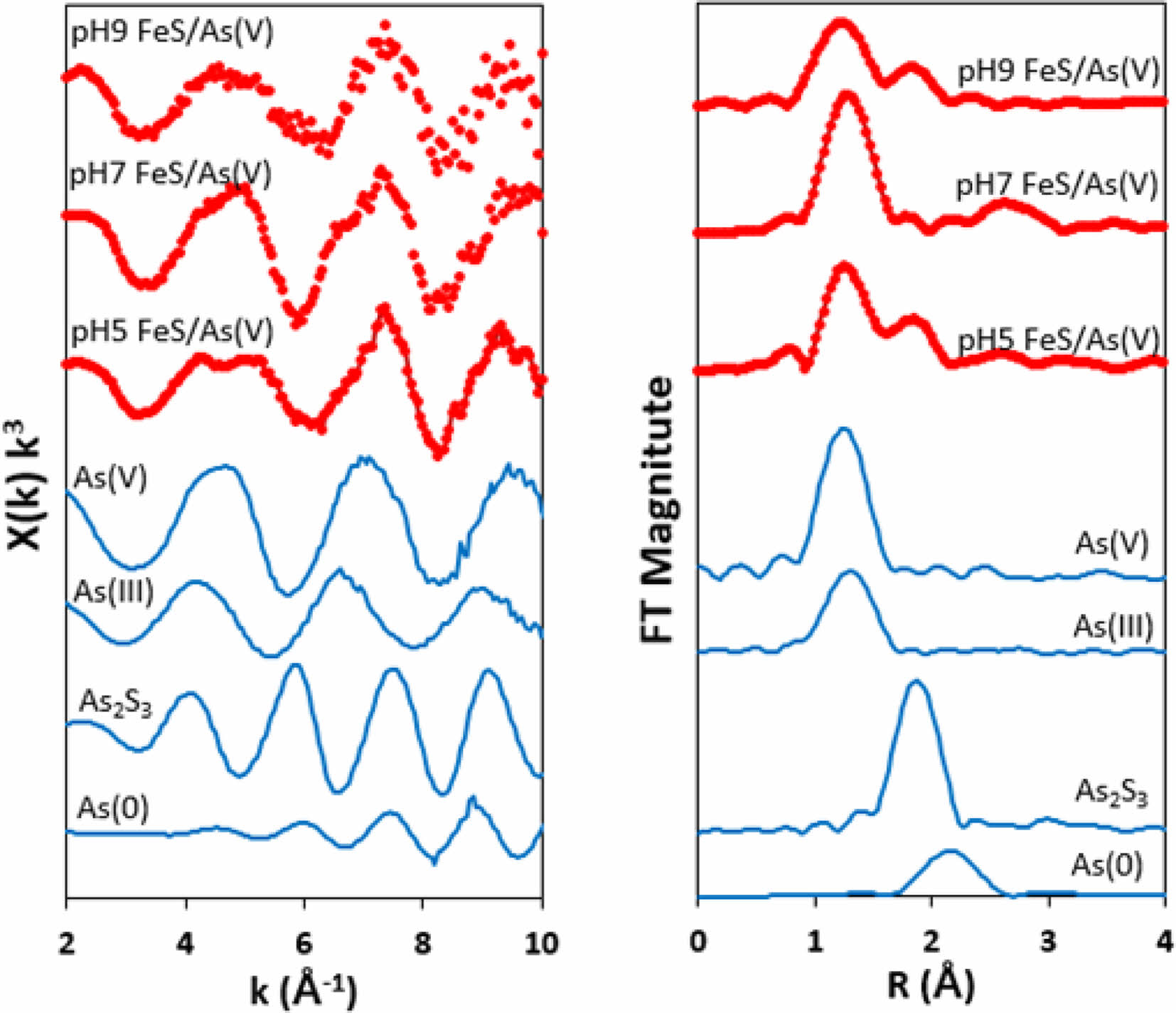 Fig. 3 As K-edge EXAFS spectra of FeS reacted with As(V) and model compounds (data reproduced from Han et al. 2018b): (A) k3 - weighed EXAFS results and (B) corresponding Fourier transform. |