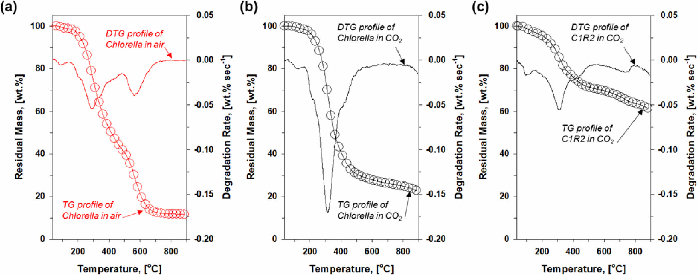 녹조류와 녹조류/RM의 혼합물(C1R2)의 열분해 특성을 조사하기 위해 Thermo-gravimetric analyzer STA449 F5 Jupiter(NETZSCH, Germany)를 사용하여 열 중량분석(TGA) 테스트를 실시하였다. 녹조류(10 ± 0.01 mg)와 C1R2 혼합물(30 ± 0.01 mg)은 열 중량분석계에 내장된 알루미나 용기에 적재하였다. 녹조류의 열 중량 분석은 공기(air)와 이산화탄소 환경에서 각각 실시하였으며 C1R2 혼합물의 열 중량분석은 이산화탄소 환경에서만 실시하였다. 공기와 이산화탄소는 유량 조절기(MFCs)를 통해 50 mL min−1의 유량으로 공급되었으며 10oC min−1로 35oC에서 900oC까지 승온하였다.