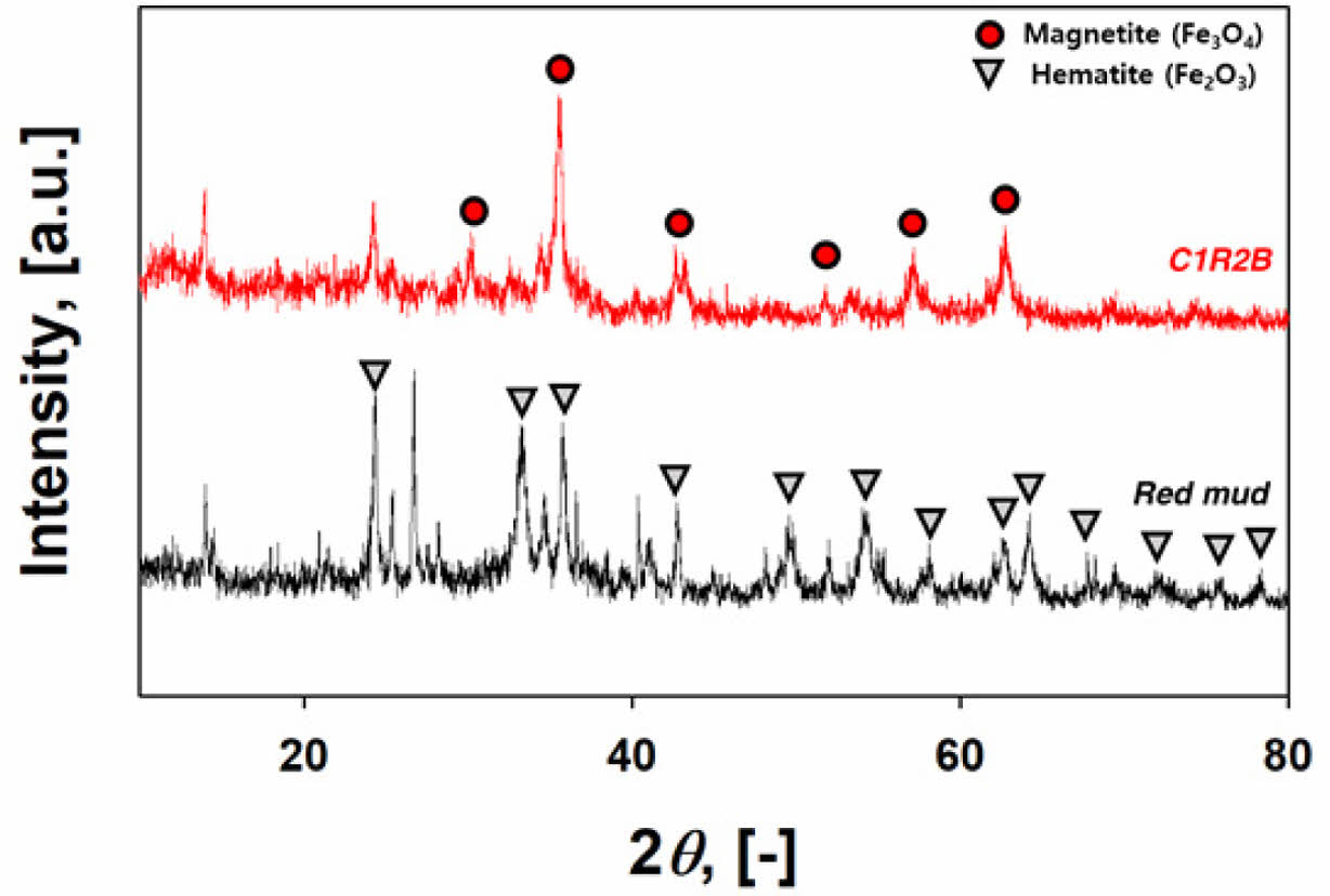 RM의 XRD 결과에서는 RM 내 철의 주요 성상이 적철석(Fe2O3, JCPDS # 33-0664, 2θ = 24.1, 33.1, 35.6, 40.8, 49.4, 54.1, 57.6, 62.4, 64.0, 70.0, 72.0, 75.4, 77.8)로 이루어져 있음을 볼 수 있다(Sahoo et al., 2021). 이 외에도 Sodalite(Na8(Al6Si6O24)Cl2, JCPDS # 81-0704), Boehmite(γ-AlO(OH)), JCPDS # 21-1307)의 피크가 관측되었다. 반면 C1R2B의 XRD그래프에서는 자철석(Fe3O4)를 나타내는 피크(JCPDS # 19-0629, 2θ = 30.2, 35.4, 43.0, 57.1, 62.6o)를 확인하였다(Marghaki et al., 2020). 이는 녹조류와의 공동 열분해가 진행됨에 따라 RM 내 Fe2O3가 자철석(Fe3O4)으로 상전이 됨을 나타낸다. Fe2O3가 열분해 과정에서 Fe3O4로 환원되는 것은 공정 중 발생하는 가스에 의한 것으로 추정된다. 자세히 말하면 열분해 과정에서 발생하는 H2와 CO가스는 대표적인 환원제로서 금속을 환원시킬 때 주로 사용하는 가스이다. 이전 연구에서는 이러한 반응을 이용하여 무기물과 플라스틱 시료의 공동 열분해로 Fe2O3를 영가철(Fe0)까지 환원시킨 바 있다(Kwon et al., 2021). 본 연구에서 Fe2O3의 환원이 Fe0까지 진행되지 않은 것은 반응에 사용한 이산화탄소가 철의 환원반응을 억제하였기 때문으로 추정된다.