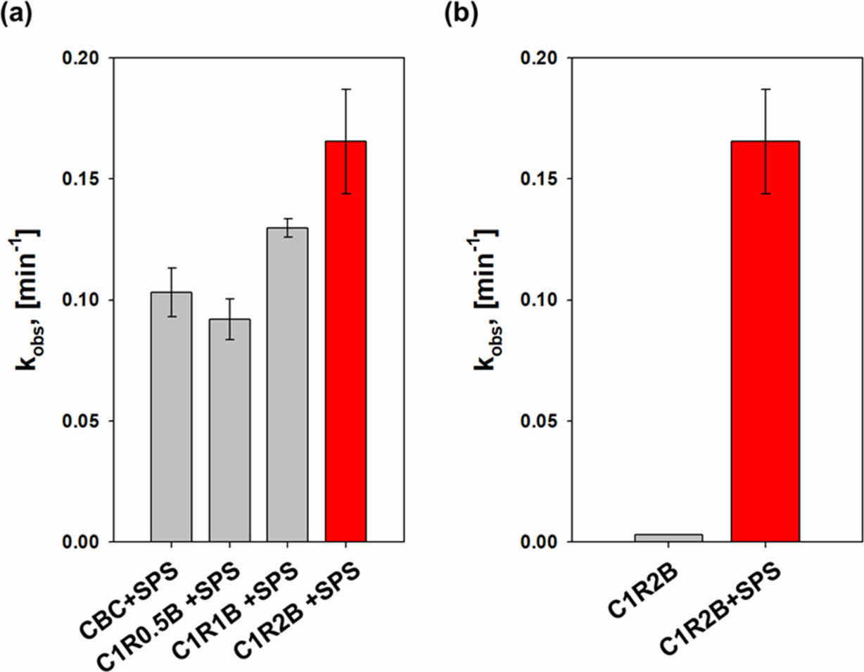 Fig. 4b은 MB 저감의 주요 반응 경로를 확인하기 위하여 MB +C1R2B와 MB + C1R2B + SPS 조건에서 실험한 결과를 나타냈다. 그 결과 MB + C1R2B에서는 MB가 거의 줄어들지 않은 것을 확인하였다. MB와 C1R2B가 존재하는 환경에서 MB 저감의 반응 경로는 주로 흡착 반응에 기인하기 때문에 이 결과는 흡착으로 인한 MB 저감이 거의 일어나지 않는 다는 것을 의미한다. 수중에서 MB는 양이온 성질을 띄고 있기 때문에 같은 양극을 띄는 C1R2B 내 Fe3O4와의 반발력으로 흡착이 거의 이루어지지 않은 것으로 보인다(Ahmad et al., 2020). 일반적으로 바이오매스의 열분해로 얻은 바이오차의 표면은 음극을 띄는 것으로 알려져 있으며 소량 제거된 MB는 C1R2B 내 녹조류에서 유래된 탄소 표면에 흡착된 것으로 보인다(Tan et al., 2020). 반면 MB + C1R2B + SPS 조건에서는 MB 제거 속도가 크게 증가한 것을 확인하였다. 이는 C1R2B와 SPS가 공존하는 환경에서 MB 저감은 대부분 SPS 활성화로 발생한 라디칼에 의한 반응이라는 것을 나타낸다.