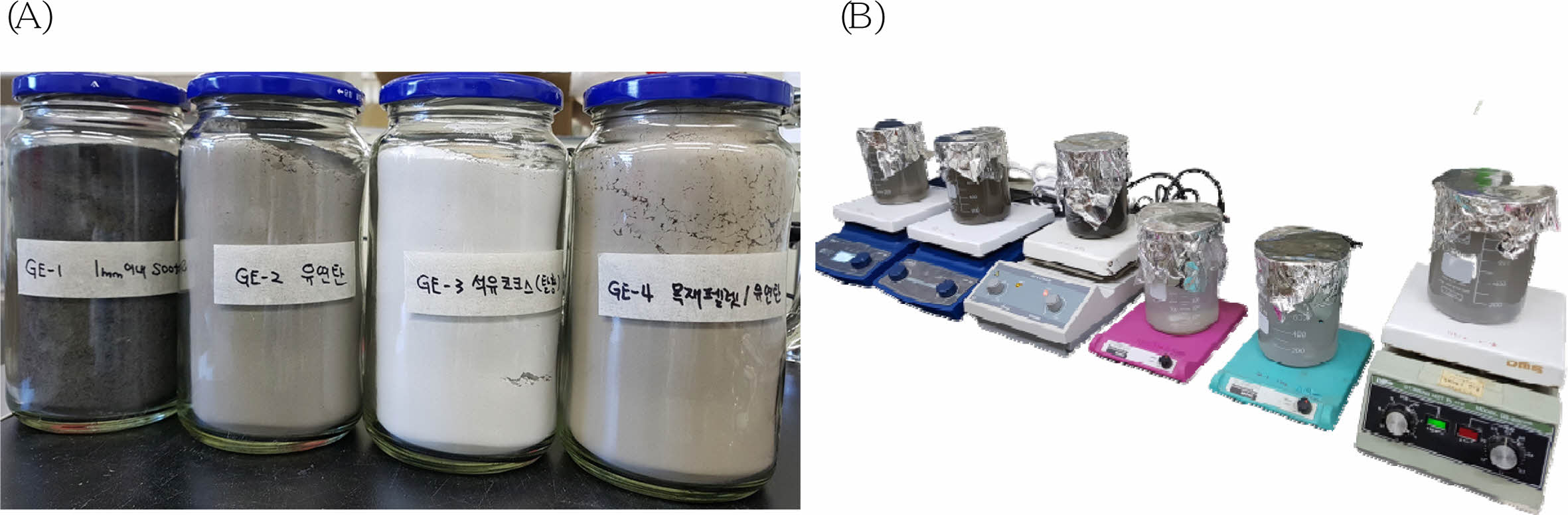 숯가루의 바닥재(GE-1), 코크스의 바닥재(GE-2), 목재펠릿과 유연탄의 혼합 연료 바닥재(GE-3), 유연탄의 바닥재(GE-4) 시료들은 폐기물 공정 시험법의 시료 조제 방법에 따라, 100 ± 5oC에서 폴리에틸렌 밧트(vat)위에 항량으로 24시간 동안 건조한 후, 눈금간격 1 mm와 0.5 mm 체에 차례로 걸러 0.5 mm 이내 입도를 가지는 분말만을 시료로 사용하였다(환경부고시 제2016-196호).