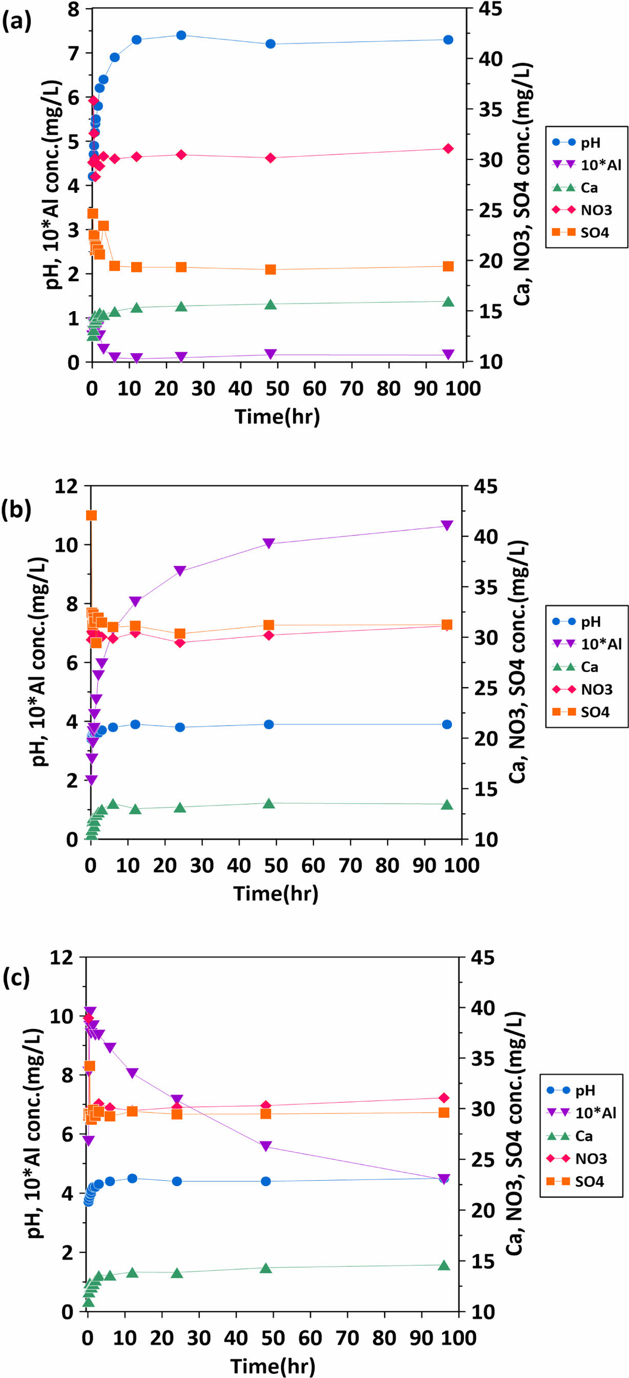 바닥재 시료를 사용하여 배치테스트(batch test)를 진행하였을 때 pH, Al, Ca, NO3, SO4의 용출농도 결과를 시료채취 시간(0.17, 0.33, 0.5, 0.67, 0.83, 1, 1.5, 2, 3, 6, 12, 24, 48, 96hr)에 따라 Fig. 3에 나타내었다. 이 연구에서는 토양오염공정시험법에서 제시한 것과 같이 0.1N HCl 용매에 1g:5ml의 비율로 용출시키거나, 폐기물 용출시험법에서 제시한 것과 같이 1g:10ml(Lee, 1995; Park et al., 2006)의 고·액비로 용출시키는 방법을 적용하지 않았다. 그 이유는 매립처분된 폐기물로부터 용출된 유해물질의 종류와 농도를 평가하고 침출수의 수질을 사전에 예측하고자 짧게는 10분~길게는 24시간에 걸쳐 수행하는 폐기물 용출시험과 달리(Park et al., 2006), 이 연구는 장기간 매립된 바닥재의 지속적인 환경영향성과 용출성분의 변동추세를 파악하기 위해 수행되었기 때문이다. 초기에 고농도의 바닥재와 반응하면, 고농도 성분의 용출로 인해 실험용액의 희석이 요구될 것이며, 희석을 한다면 저농도로 용출되는 성분은 충분히 감지되지 않을 수 있다고 판단하여 1g:1000ml의 고·액비를 적용하여 오랜 시간(96시간)에 걸쳐 배치테스트를 수행하였다.