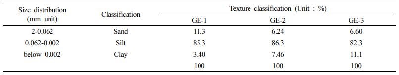 이 연구에서 사용된 바닥재의 입도는 Table 1과 같다. GE-1은 나무를 연소하는 과정에서 형성된 분진으로, 체에 걸렀어도 모래의 직경으로 분류되는 입자가 11.3%로 GE-2와 GE-3에 비해 약 2배 가까이 조성이 높게 나타난다. GE-2와 3 시료는 점토의 직경으로 분류되는 입자가 더 많이 관찰되며, GE-3에서 점토 직경의 입자들이 더욱 많이 존재하는 것으로 분석되었다. GE-1 시료는 산불과 같이 자연적인 과정에 의해 발생할 수 있는 분진이며, 화력발전소 바닥재와 비교하였을 때 6mm 이내 직경으로 분쇄하여 연소되는 목재펠릿의 연소특성을 보여줄 수 있다. 그에 비해, GE-2와 3 시료는 코크스(cokes)의 바닥재, 유연탄 및 목재펠릿(flaming coal and wood pellet)의 바닥재로, 표면적이 훨씬 넓고 연소효율도 높아 분진의 입도가 상당히 작은 것으로 추정된다.