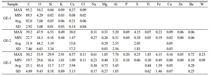 표면의 화학조성은 Fig. 2(A), (C), (E)의 각 5개 지점을 에너지 분산형 분광분석기(EDS)로 조사하여 평균값을 구하였다(Table 2). GE-1 표면의 주요 구성성분은 탄소와 산소로 측정되었고(99.7%), GE-2의 주요 구성성분은 탄소, 산소, 칼슘, 규소이며(94.3%), 알루미늄과 황이 각각 2%로 미량 측정되어, 특정 조건에서 강우와 반응하는 경우 황산염 및 알루미늄 금속성분의 용출이 나타날 수 있을 것으로 여겨진다. GE-3 표면의 주요 구성성분은 산소, 탄소, 규소, 알루미늄, 칼슘이며(93.6%), 칼륨과 철이 각각 2.17%, 1.59%로 미량 관측되었다.