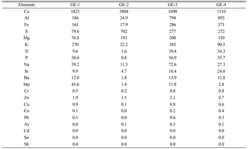 K은 표면적 화학 성분 분석에서 GE-2의 함량이 GE-1보다 높게 측정되었지만, 총함량 분석 결과 GE-3>GE-1>GE-4>GE-2 순으로 나타났다. 반응용액의 pH 조건 및 반응 시간 등의 환경에 따라 바닥재와 결합한 성분의 용탈정도에 차이가 있을 수 있다. 또한, Song et al. (2001)이 발표한 바와 같이, 생물연료 연소(Biomass burning)의 특징적 지시자로서 K가 검출되었을 가능성이 있을 것으로 여겨진다. GE-1은 참나무의 연소산물이며, GE-3는 목재펠릿 혼합연료의 연소산물로, 연소된 목재류로부터 기원한 K이 결합 형태에 따라 다소간 함량 차이를 보이며 나타난 것으로 보인다.