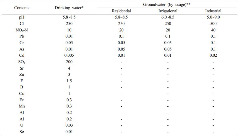 Table 4 Regulations of contaminants and their maximum contaminant levels in water by usage with mg/L unit (Korea) |