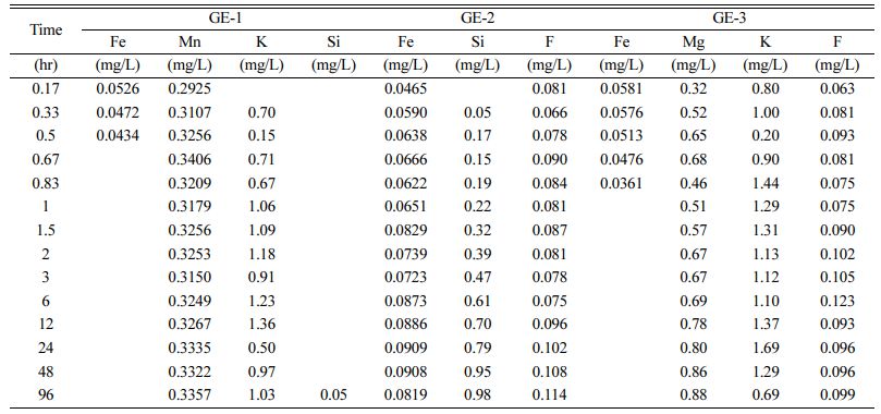각 바닥재의 주요 총함량 성분들이 강수와의 반응에 의해 용출되는 정도를 판단하고자 Table 5에 성분별 용출 농도를 제시하였다. Fe와 0.0526mg/L, K은 1.36mg/L, Mn은 0.3406mg/L 이하의 농도로 측정되었으며, GE-2은 Fe의 용출 농도가 0.909mg/L 이하, GE-3는 Fe 0.0581 mg/L, Mg 0.88mg/L, K 1.69mg/L 이하로 측정되었으며, 해당 성분들은 시간에 따라 용출 농도가 안정화되는 경향이 나타났다. 따라서 실험에 사용한 시료들이 바닥재로서 부지 내 매립되었으며 상당한 강우가 오래 지속되었을 경우, 양이온 및 음이온의 용출로 인한 오염 가능성은 미미할 것으로 판단한다.