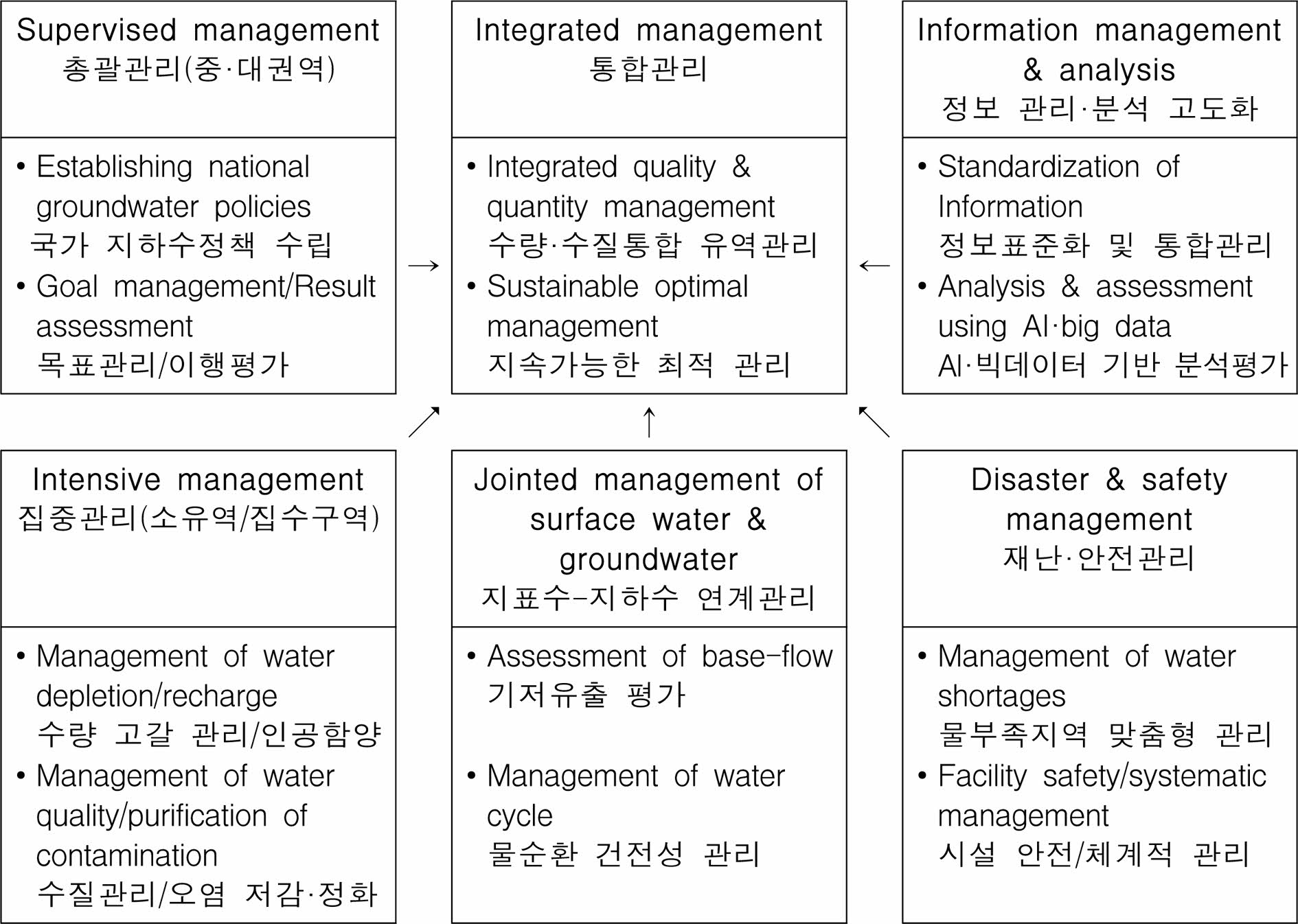 정부에서는 물관리 일원화 실현을 위해 2018년 6월 물관리기본법을 제정하고, 2021년 6월 국가물관리기본계획을 수립하였으며, 지하수 분야도 2021년 1월 지하수법 개정을 통해 수량·수질 통합관리의 기반을 마련하였다. 이에 4차 산업혁명의 신기술을 활용한 스마트 물관리 기술의 확산과 기후변화로 인한 가뭄 등 급변하는 물 환경에 대응하기 위해 정부의 통합 물관리 정책에 부합하는 지하수 통합관리 선진화전략 수립이 필요한 시점이다.