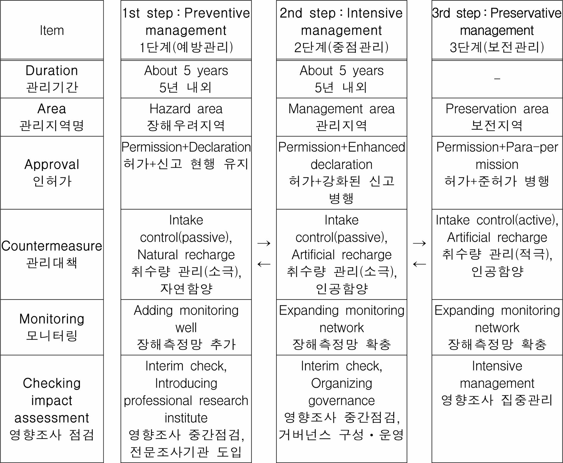 우선 1단계 예방관리 단계에서는 먹는샘물, 온천, 수막재배, 골프장 등 대용량의 지하수를 이용하는 지역을 대상으로 측정망 등 지하수 모니터링 자료와 전문가 및 지자체 의견을 검토하여 매년 예방관리 지역을 선정한다. 이 지역은 장해측정망을 설치하여 지하수위 저하 등에 대한 모니터링을 실시하고, 지하수영향조사 평가를 강화한다.