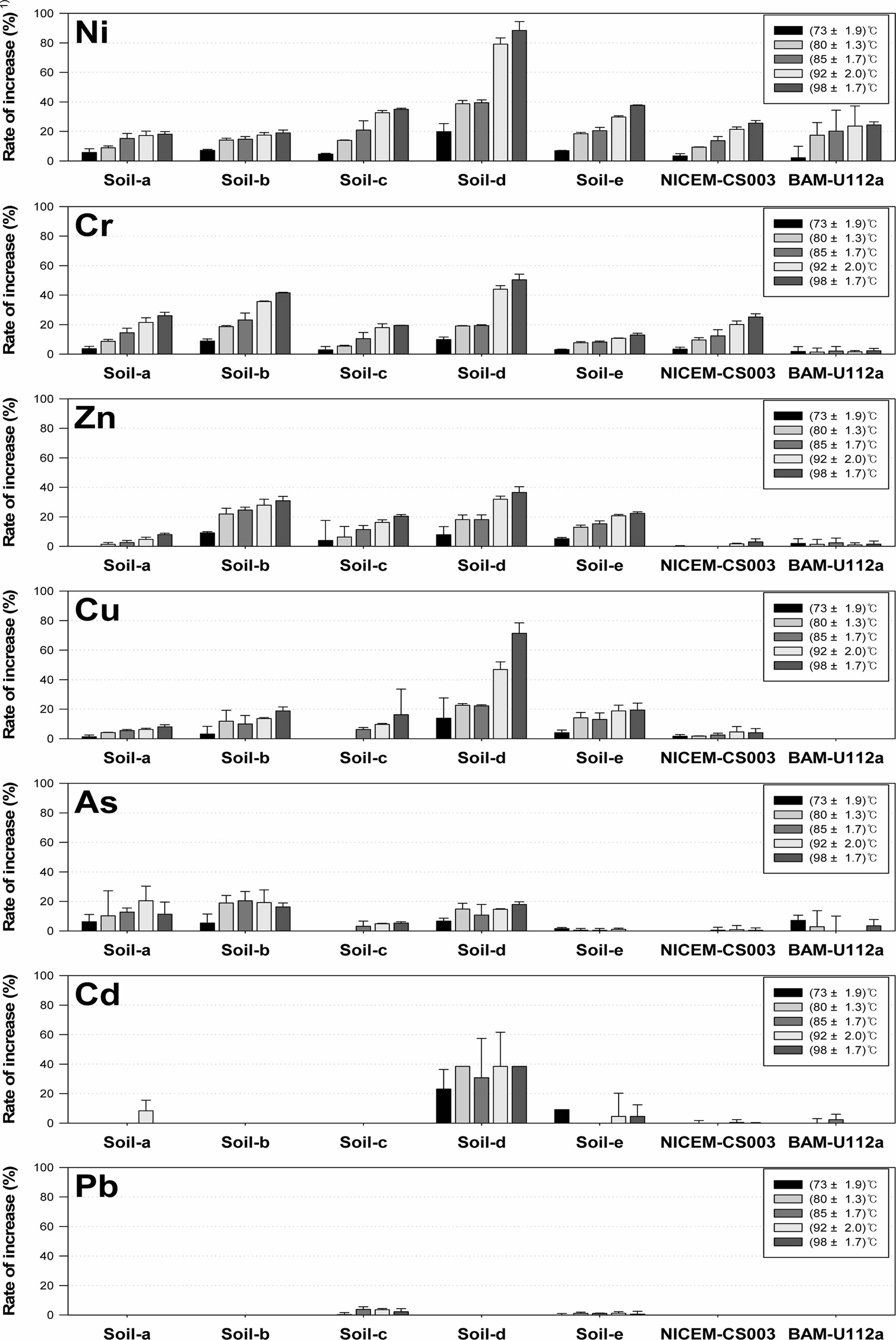 가장 낮은 분해온도(66 ± 2.0)oC에서 측정된 중금속의 농도를 기준농도로 하고 이에 대비하여 분해 온도 증가에 따라 측정된 시료들(총 7점, 토양시료 5점 및 CRM 2점)의 농도 증가율을 구한 뒤 이들의 평균값을 적용한 결과 Ni 7.09% ~ 35.42%(평균 22.41%) > Cr 4.79% ~ 25.40% (평균 14.96%) > Zn 3.99% ~ 17.52%(평균 11.17%) > Cu 2.22% ~ 19.34%(평균 10.17%) > As 3.54% ~ 8.26%(평균 6.51%) > Cd –5.08% ~ 1.08%(평균 –0.28%) > Pb –4.71% ~ –1.70%(평균 –3.07%) 순서로 분해 온도에 따른 증가율의 변화가 나타났다(Table 3과 Table 4). 가장 큰 증가율이 나타난 Ni의 경우 분해 온도를 (66 ± 2.0)oC에서 (73 ± 1.9)oC, (80 ± 1.3)oC, (85 ± 1.7)oC, (92 ± 2.0)oC, (98 ± 1.7) oC로 높여주면 (66 ± 2.0)oC 조건에 대비하여 각각 7.09%, 17.25%, 20.67%, 31.62%, 35.42%로 증가하였으며 두 번째로 영향을 많이 받은 금속은 Cr이었으며 Ni과 동일하게 구간별로 분해 온도를 올릴 때 마다 (66 ± 2.0)oC 조건에 대비하여 각각 4.79%, 10.08%, 12.88%, 21.63%, 25.40%로 모든 시료에서 분해 온도가 상승할수록 Cr 농도 또한 증가하였다.