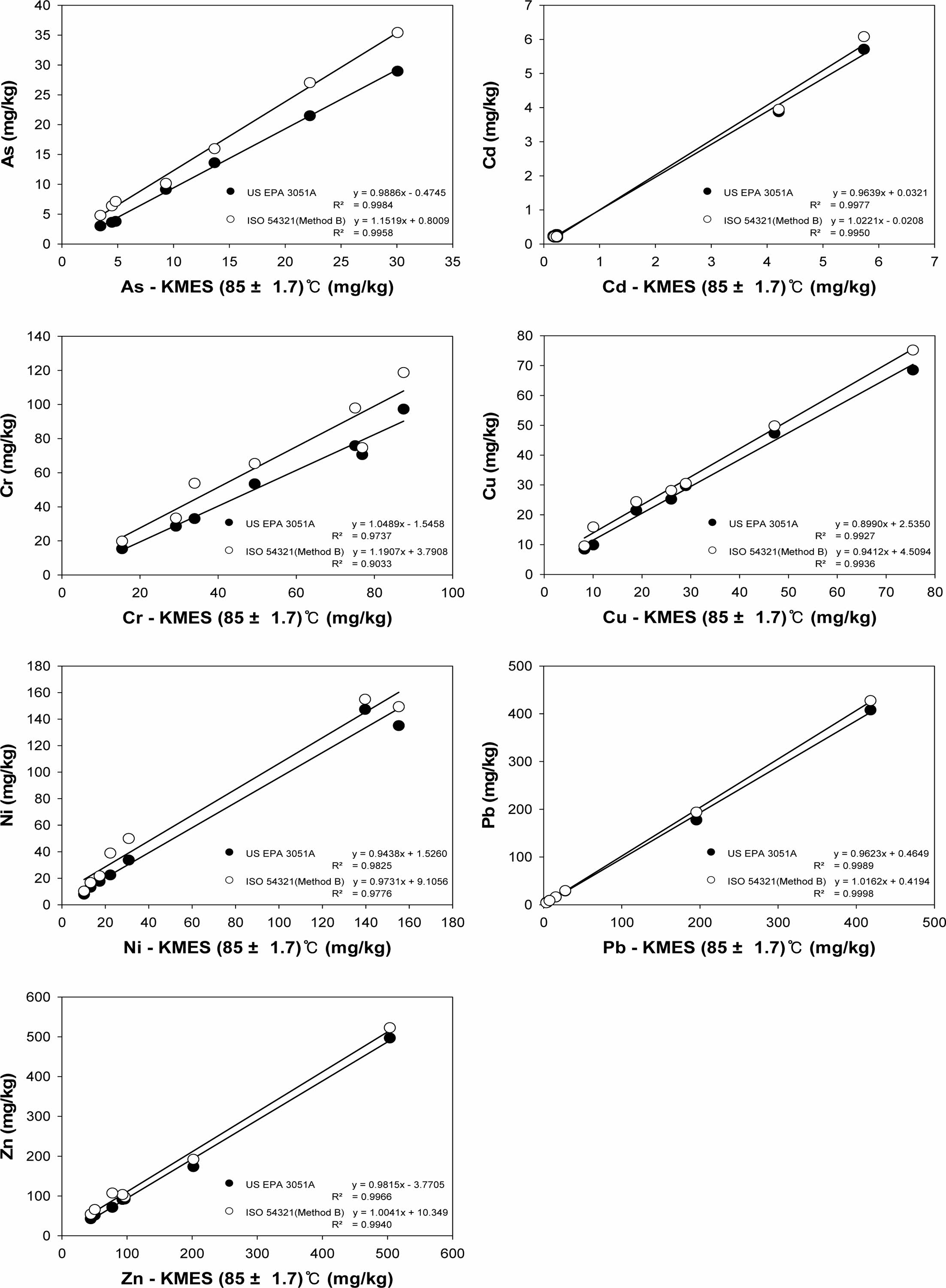 Lima et al.(2016)은 CRM(NIST 2709, NIST 2782)을 대상으로 US EPA 3051, US EPA 3051A 및 ISO 12914 간의 비교시험에서 사용한 산 용액의 종류 및 농도에 따라 중금속 추출효율이 다르게 나타났으며 특히 HCl 사용량이 많은 ISO 12914에서 분해 효율이 더 크다고 보고하였다. Guedes et al.(2020)은 US EPA 3051A와 왕수 분해 방법을 비교 시험하였는데 Pb의 경우 여과 잔류물은 여과 과정에서 짧은 시간에 Al2O3, Fe2O3 및 SiO2에 의한 재흡착이 일어나 왕수 분해 방법 보다 US EPA 3051A 적용 시에 더 많은 흡착이 일어남을 보고하였지만 본 연구에서 Pb의 농도는 방법 간 차이가 나타나지 않아 재흡착에 의한 영향은 없는 것으로 판단된다. 이와 같은 결과를 종합적으로 고려해보면 US EPA 3051A와 ISO 54321(Method B) 모두 같은 분해 온도 조건을 사용하였음에도 사용된 시약 및 시료들의 반응에 의한 차이로 US EPA 3051A가 ISO 54321(Method B)보다 분해 효율이 낮은 것으로 판단되며 토양오염공정시험기준의 분해 온도를 (85 ± 1.7)oC로 설정하고 US EPA 3051A와 비교 시험한 경우를 보면 US EPA 3051A가 높은 온도에서 분해되었지만 유사한 결과가 나타난 것은 토양오염공정시험기준에서 적용된 왕수의 분해 효과에서 기인 된 것으로 해석된다. 본 연구에서 토양오염공정시험기준(분해 온도, 85oC ± 1.7oC) 대비 ISO 54321(Microwave, 175oC ± 5oC) 및 US EPA 3051A(Microwave, 175oC ± 5oC) 간의 상관성 분석은 Fig. 2에 나타내었다.