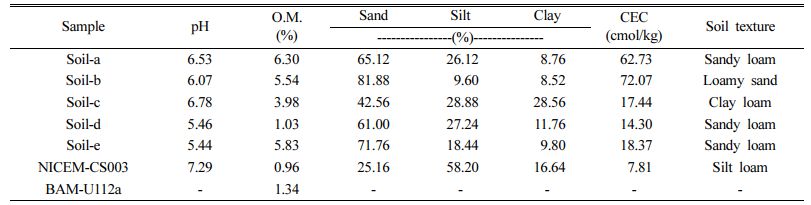 토양 이화학 특성이 다른 일반토양 5점과 정확도 평가를 위한 토양인증표준물질(CRM) 2점을 공시토양으로 사용하였다. 일반토양 5점은 현장에서 채취하고 실험실로 운반하여 건조기(Dry oven, 40oC)에서 말리고 10 mesh 표준체(눈금간격 2 mm)로 체거름 한 후, 100 mesh 표준체(눈금간격 0.15 mm)로 다시 체거름 하여 사용하였으며 토양인증표준물질은 서울대학교 농생명과학공동기기원(NICEM)에서 국내 토양을 기반으로 생산하여 판매 중인 CRM (NICEM-CS003)과 독일연방표준과학원(BAM)에서 생산하여 판매 중인 CRM(BAM-U112a)을 각각 사용하였다. 시험 토양에 대한 pH는 토양오염공정시험기준(ES 07302.1b)으로 측정하였고 유기물함량은 1 N 중크롬산칼륨 용액으로 유기물을 산화시킨 후 0.5 N 황산철 용액을 이용하여 역적정(back titration) 하는 방법(Walkley and Black, 1934), CEC는 1 N 초산암모늄(pH7)을 사용하여 침출 후 흡착된 NH4를 재용출 후 증류 적정하여 측정하였으며(Chapman, 1965), 토성은 Stoke의 법칙에 기반한 침강법 중 피펫법을 사용하여 평가하였다(Gee and Bauder, 1986). 토양 이화학 특성은 Table 1과 같다.