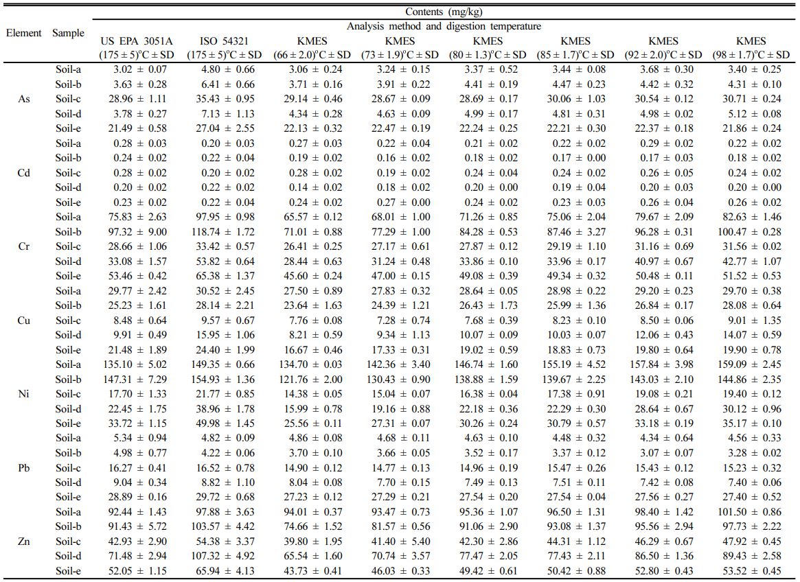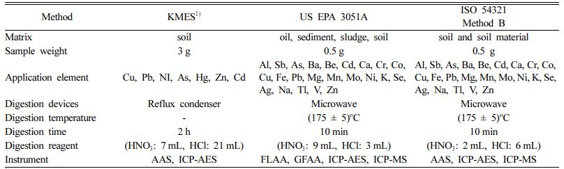 토양 중 중금속을 추출하는 방법으로서 국제적으로 통용되는 방법은 미국 환경 보호국(US EPA) SW-846의 산분해 습식방법 3050B(US EPA, 1996)와 마이크로파 분해 방법 US EPA 3051, US EPA 3051A, US EPA 3052가 있으며 국제표준화 기구(ISO)에서는 ISO 54321이 국제표준으로 제정되어 있다. 이들 시험방법 중에서 산분해 과정의 분해 온도가 명시되어 있는 US EPA 3051A 및 ISO 54321(Method B)와 토양오염공정시험기준에 2.4.1에서 도출된 최적의 산분해 온도 조건을 적용한 방법을 대상으로 분석 방법 상호 간의 중금속 분석 결과를 비교 평가하였다. 각 시험방법의 주요 절차에 대한 비교는 Table 2에 나타내었다.
