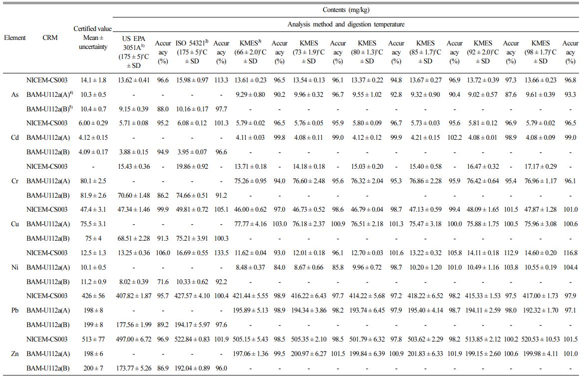 토양오염공정시험기준에 따라 중금속 CRM을 분석한 결과 분해 온도(85 ± 1.7)oC에서 정확도가 가장 높게 나타났다. 국제적으로 토양 중금속을 정량하는 방법으로는 미국 환경 보호국(US EPA) SW-846의 산분해 습식방법(US EPA 3050B)과 마이크로파 분해방법(US EPA 3051, US EPA 3051A, US EPA 3052)이 있으며 국제표준화 기구(ISO)에서는 ISO 54321 등을 표준으로 제정하고 있다. Peña-Icart at al.(2011)은 US EPA 3050B와 ISO 11466으로 토양 및 퇴적물 등의 총 금속 함량 또는 그중에 일부를 추출할 수 있으며 시료 및 원소에 따라 분해효율이 다르게 나타날 수 있다고 하였다. Santoro at al.(2017)은 슬러지 시료에 대해 국내 토양오염공정시험기준과 유사한 ISO 11466과 ISO 12914로 As, Cd, Cr, Cu, Fe, Ni, Pb, Zn 등 금속 성분을 평가한 결과 Fe을 제외한 모든 원소가 두 시험방법 간 차이가 없는 것으로 보고하고 있지만 ISO 11466의 경우 분해 온도가 명시되어 있지 않아 분해 온도에 의한 평가는 확인할 수 없었다.