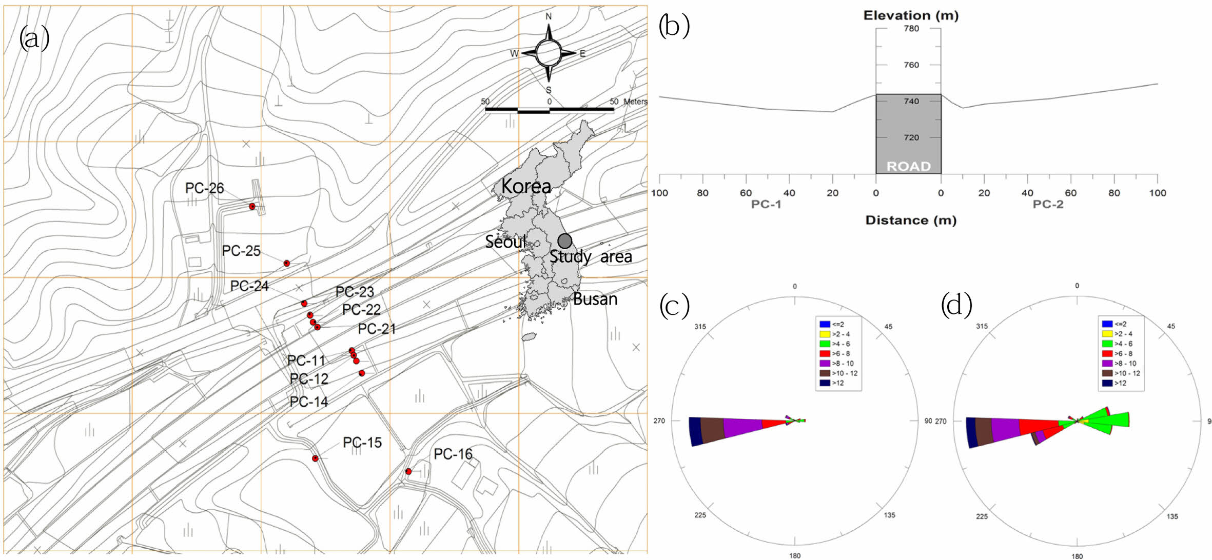 연구지역은 50번 고속도로의 대관령 IC로부터 진부 IC방향으로 약 3.5 km(영동선 208.4k)에 위치하였다. 농경지는 고속도로로부터 약 50 m 정도 떨어져 있었다(Fig 1a). 평균온도는 동절기(12월부터 다음해 3월까지) –4.0oC, 비동절기(3월부터 11월까지) 13.2oC로 동절기에는 지속적으로 제설제를 살포하는 지역이었다(KMA, 2021). 고속도로를 기준으로 배수로는 남쪽 사면은 20 m, 북쪽 사면은 10 m 지점에 위치하여 사면의 경사도는 남쪽이 북쪽 보다 약 2배 정도 완만하였다(Fig. 1b). 강수량은 동절기 229 mm, 비동절기 2,432 mm로 비동절기에 10배 이상 집중되어 동절기에 살포된 제설제 성분이 비동절기 기간에 강우로 인해 희석되어 그 농도가 매우 낮을 것으로 예상되었다. 평균풍향은 동절기에 서서남(242.5도), 비동절기는 남남서(189.5도) 방향으로 연평균 풍향은 서남풍(207.3도)이었다(KMA, 2021). 최대 풍향풍속은 동절기는 16.5 m/s이고 비동절기는 14.2 m/s로 최대풍속의 풍향은 모두 서풍(270도)이었다(Fig. 1c, Fig. 1d). 고속도로의 방향이 동동북(북의 기준으로 시계방향으로 약 70도) 방향이므로 주풍향으로 인해 비산된 제설제는 도로의 남남동쪽(이하 남쪽)에 더 집적될 것으로 예상되었다.
