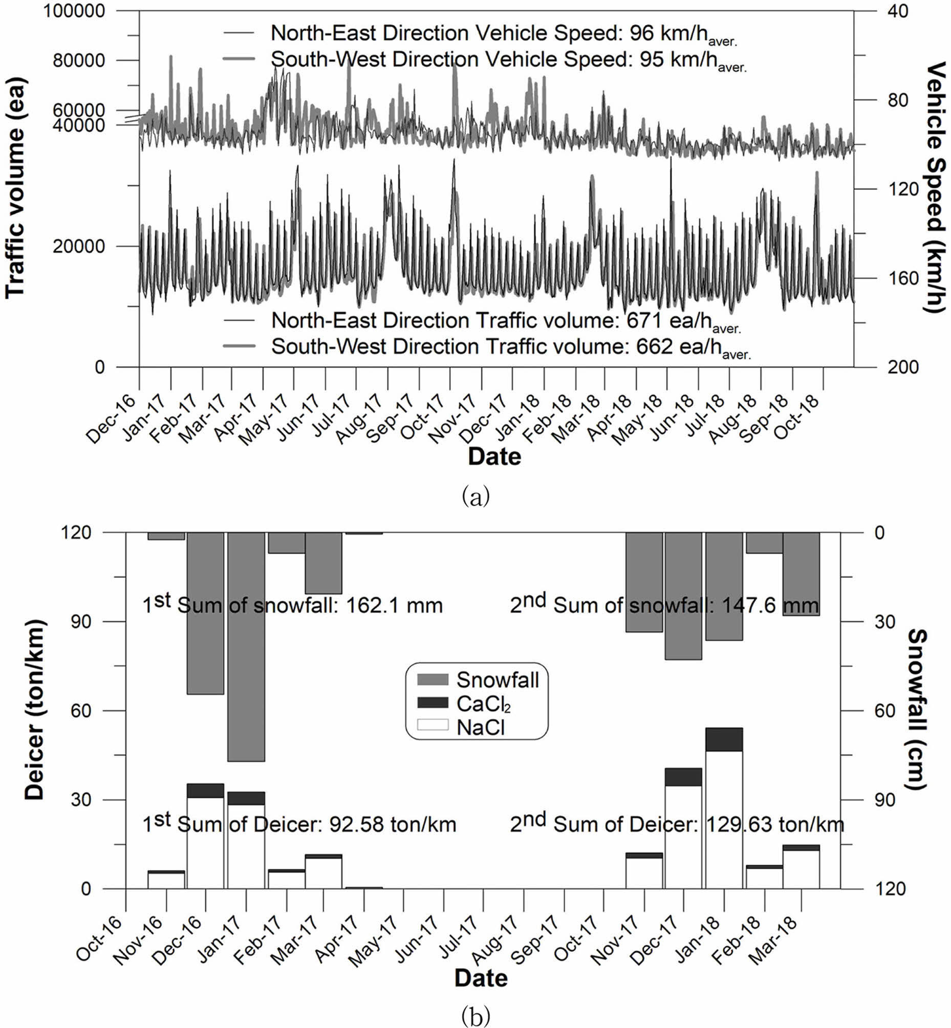 Fig. 2 The graph showing traffic volume and vehicle speed (a), amount of snowfall and applied deicer (b) during the study periods. |