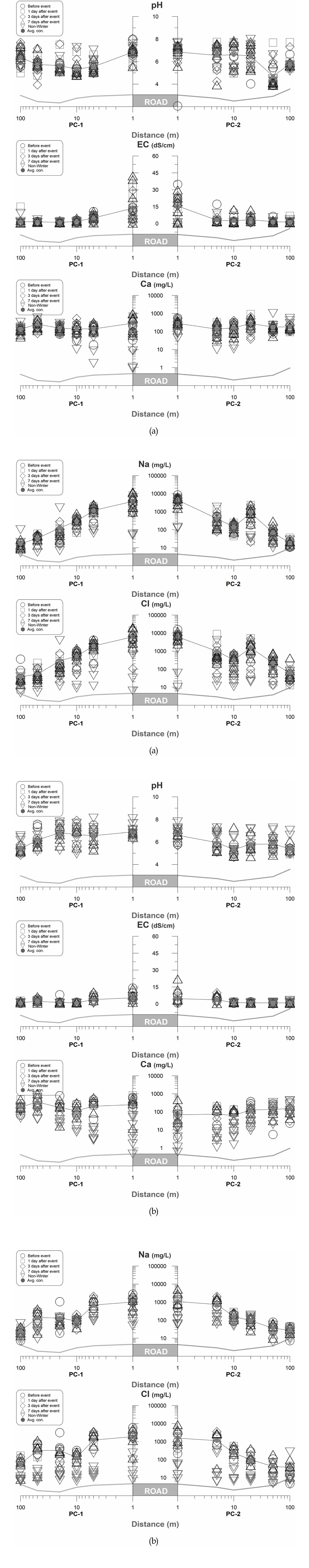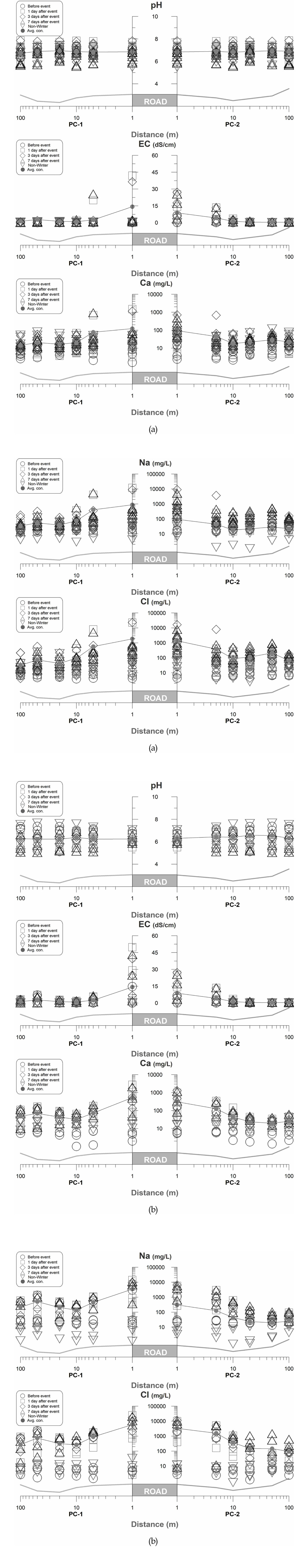 Fig. 3은 거즈 시료의 pH, EC 및 제설제 성분(Ca2+, Na+, Cl-) 등의 각 항목의 농도에 대해 고속도로를 중심으로 남쪽(PC-1)과 북쪽(PC-2)으로 구분하고 시기별과 거리별로 나타낸 것이다. 거즈의 시료 채취의 시기를 강설 전(○), 강설 후 1일(□), 3일(◇), 7일(△), 그리고 비동절기(▽)로 구분하고 이들의 평균 농도(●)를 나타낸 것이다. 거즈에서 각 항목농도는 고속도로로부터 1 m 지점에서 가장 높았고 5 m 지점을 벗어나며 급격히 감소하는 경향을 나타내었다. 고속도로 남쪽은 강설 후 1일에 각 항목의 분석값이 최고치를 보였지만, 북쪽은 강설 후 3일과 7일에서 최고 높은 것으로 나타났다.