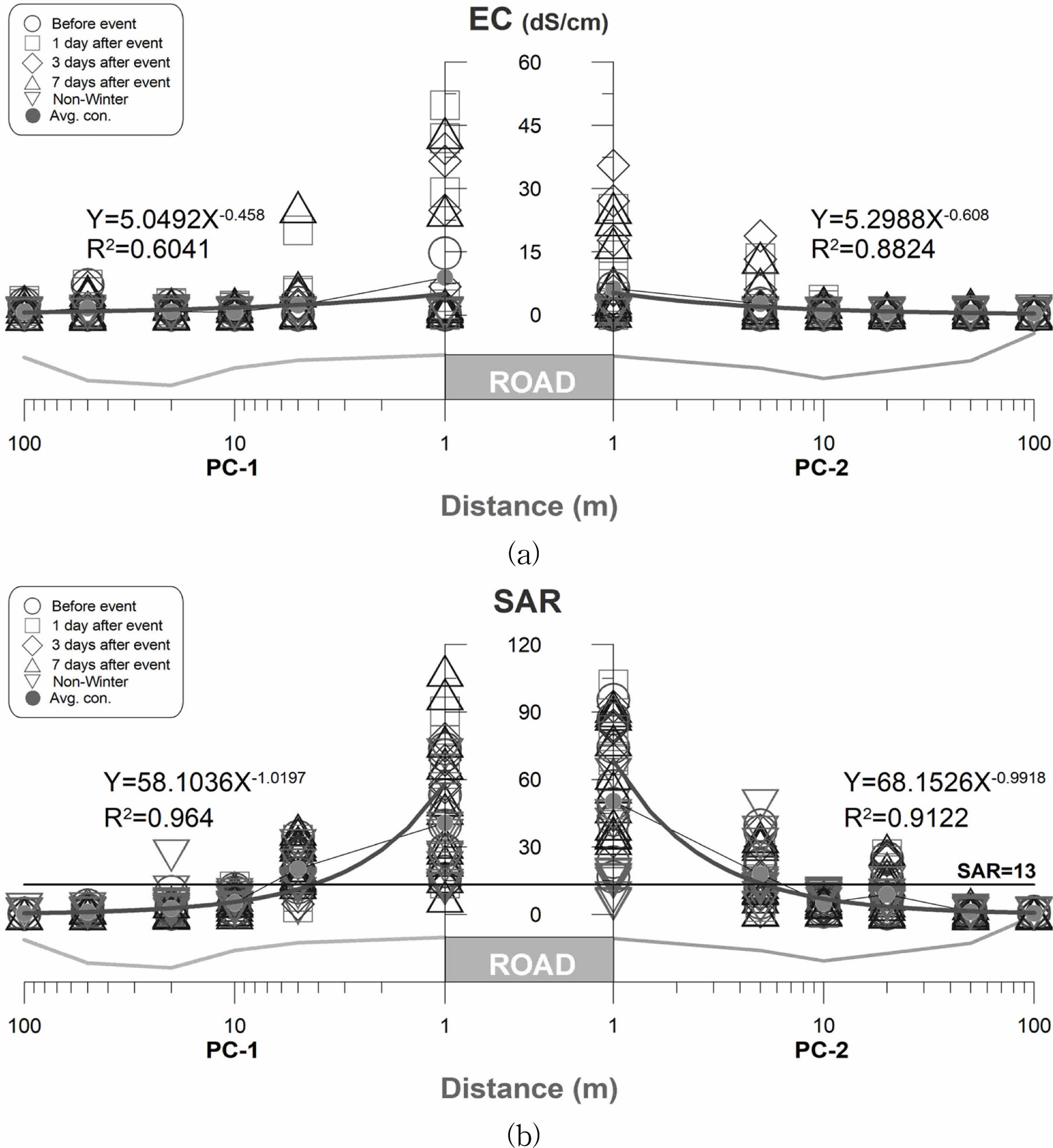 한편 토양의 SAR 값을 이용한 회귀식의 확산모델은 남쪽과 북쪽에서 각각 Y=58.1036X-1.0197과 Y=68.1526X-0.9928였고, 토양에 유입된 제설제의 분포 범위는 각각 4.3 m와 5.3 m까지로 나타났으며 설득력은 각각 0.98(R2=0.9640)과 0.96(R2=0.9122)이었다(Fig. 5b). 이는 제설제의 비산에 의한 최대 확산 거리 모델링 결과가 남쪽 및 북쪽 각각 최대 3,500 m와 507 m 인 것과는 다르게 토양에 유입된 제설제 성분은 5.3 m 이내에 주로 집적된다는 것을 보여준다. 이는 토양에 대한 실측값과도 매우 유사한 결과였다.