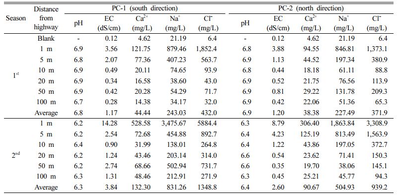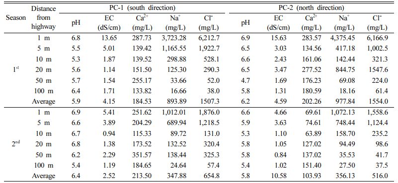Table 2는 토양시료의 pH, EC 및 제설제 성분(Ca2+, Na+, Cl-) 등의 각 항목의 분석값의 평균을 고속도로를 중심으로 남쪽(PC-1)과 북쪽(PC-2)으로 구분해 거리별로 나타낸 것이다. 각 항목의 평균 분석값을 남쪽 및 북쪽으로 나눠 비교하면, 1차 조사에서는 북쪽에서의 분석값이 남쪽의 1.03~1.11배로 유사하였고 2차 조사에서는 Na+만 제외하면 남쪽에서의 분석값이 북쪽보다 1.01~2.05배 높았다.