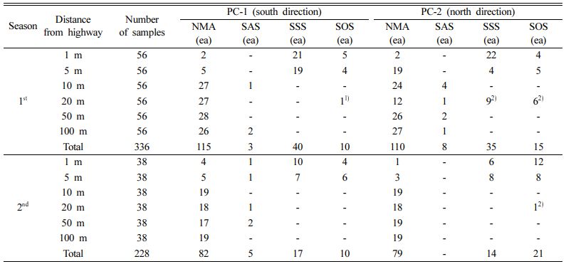 Table 1은 고속도로에서 일정 거리별로 이격된 지점에서의 거즈 시료의 pH, EC 및 제설제 성분(Ca2+, Na+ 및 Cl-) 등 각 항목의 분석치에 대한 평균값을 고속도로를 중심으로 남쪽(PC-1)과 북쪽(PC-2)으로 구분해 시기별과 거리별로 나타낸 것이다. pH의 경우 6.2~6.9 범위로 약산성에서 중성으로 2차 조사와 비교해 1차 조사에서 조금 높았다. 바탕시료(blank)에 대한 거즈 시료의 농도 수준은 EC가 2~119배, Ca2+은 3~114배, Na+은 1.6~164배, 그리고 Cl-은 5~913배로 높게 나타났다. 제설제 성분의 농도는 Cl-> Ca2+> Na+ 순으로 높게 나타났다. 고속도로로부터 100 m 떨어진 지점에서의 제설제 성분 농도가 바탕시료의 1.6~5배 수준으로 검출되는 것으로 보아, 비산범위가 고속도로로부터 100 m 이상일 것으로 판단되었다.
