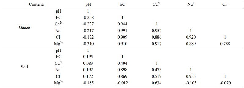 Table 4 Correlation coefficients of pH, EC, Ca2+, Na+ , Cl-, and Mg2+ in gauze and soil |