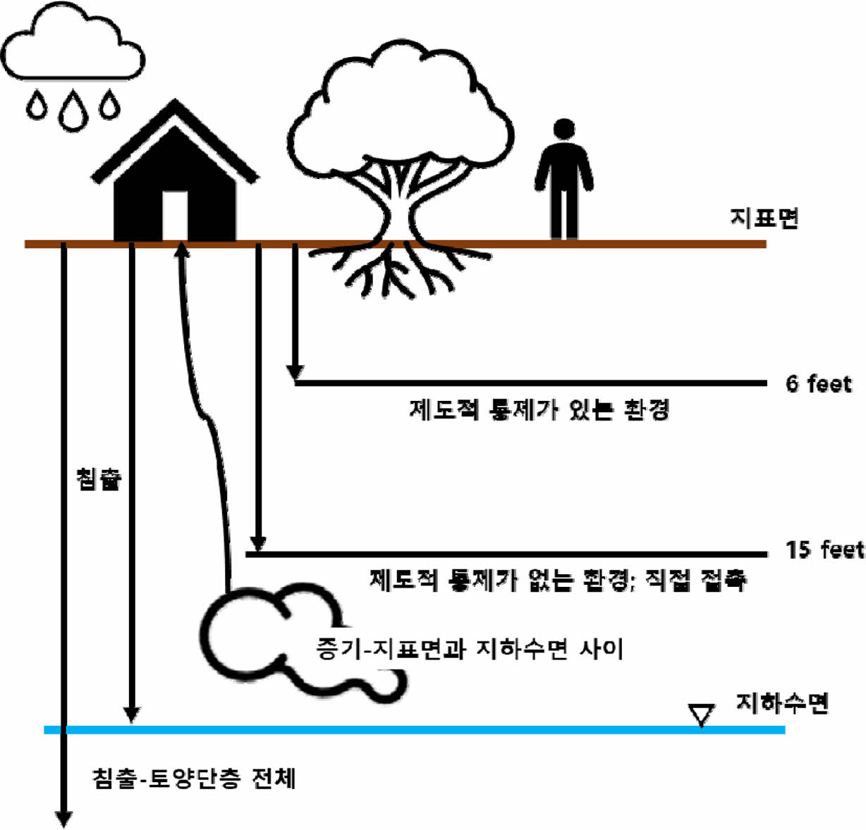 해외에서는 ‘부지’를 토양/대수층이 오염된 지표/지중환경(Swartjes 2011)으로 정의하고 오염 관리의 대상으로 하고 있다. 국내에서도 부지개념모델 작성을 위해서는 조사의 대상인 ‘부지’의 정의에 대한 합의가 우선되어야 하지만, 통용되는 명확한 정의가 없으므로 해외의 ‘부지’ 및 ‘오염부지’ 개념을 참고하여 국내에서 활용할 수 있는 ‘부지’의 정의를 제안하였다. 부지의 범위를 정의하기 위해서는 수평적인 범위와 수직적인 범위를 구분하는 것이 필요하다. 수직적 범위는 정화/관리기준이 충족되어야 하는 매체별 지점의 깊이까지를 포함해야하며, 이는 Fig. 1과 같이 미국 워싱턴주의 [유해폐기물 정화법(MTCA: Model Toxics Control Act)]를 기반으로 하여 오염물질의 확산 가능성, 수용체, 적용 가능한 위해저감조치에 따라 심도를 세분화할 수 있다. 토양의 섭취, 피부접촉과 같은 직접 노출경로에 대해서는 지표면 이하 15 feet(~4.6 m)까지, 지하수로의 확산을 고려했을 때는 지하수면 아래를 포함한 모든 심도까지, 휘발성 물질 흡입의 노출경로에 대해서는 지하수면까지가 부지의 수직적 범위가 될 수 있다.