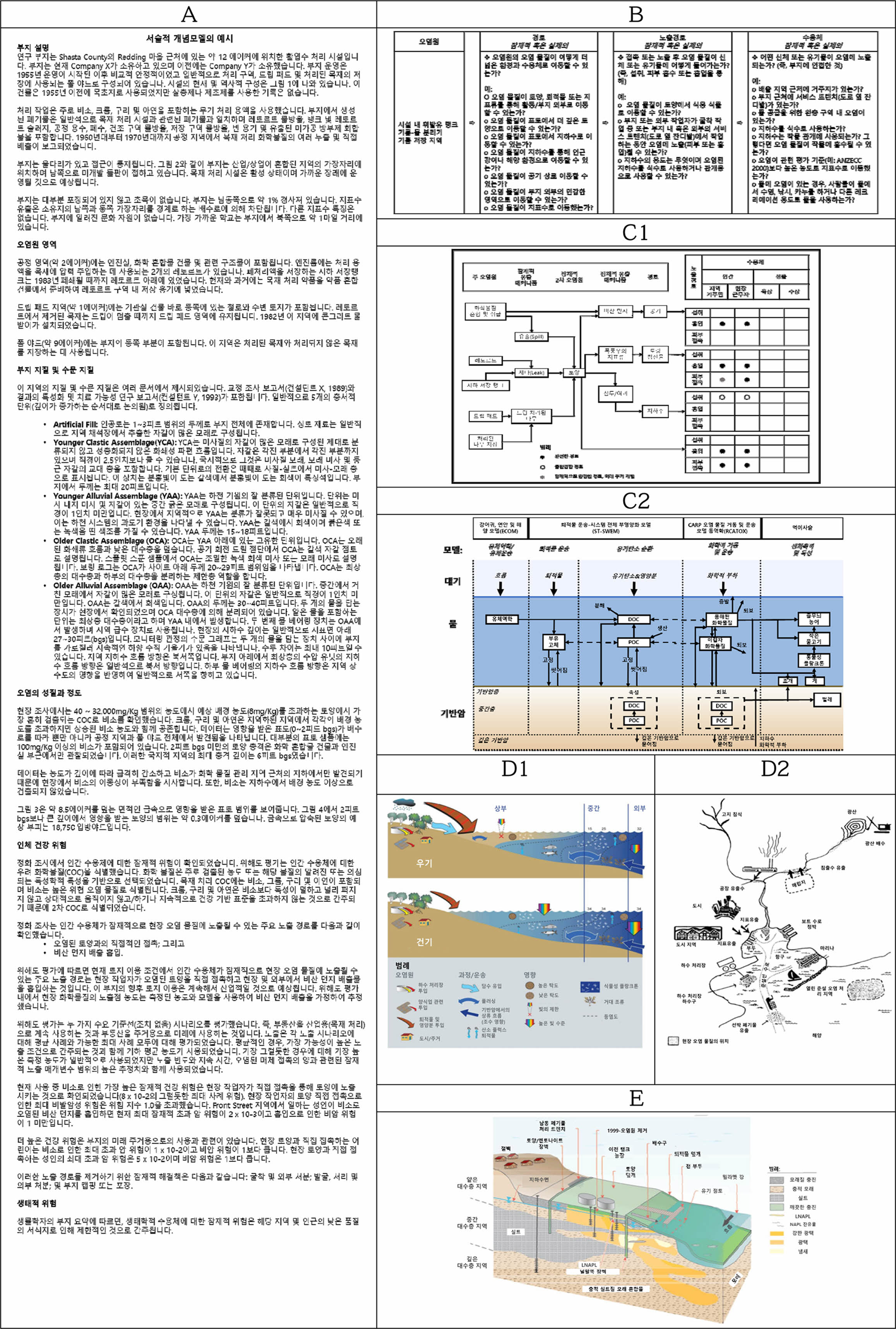 Fig. 8은 오염부지 관리 단계별 부지개념모델의 개선 사례이다. 초기의 개념적인 표현에서 조사가 진행되는 과정에서 점차 정량적이고 정밀한 정보가 추가 및 보완되는 것을 확인할 수 있다.