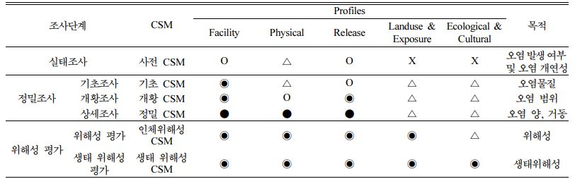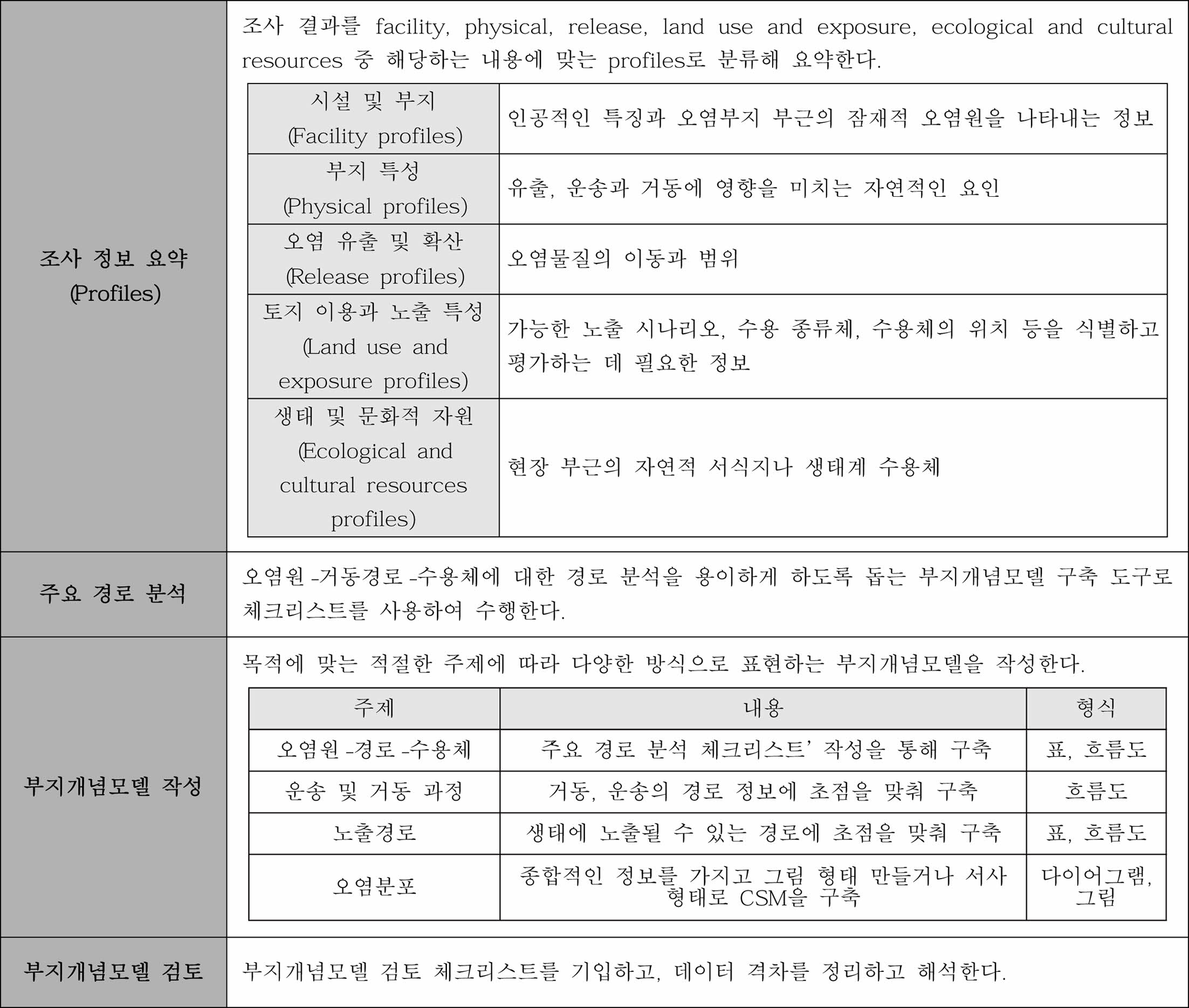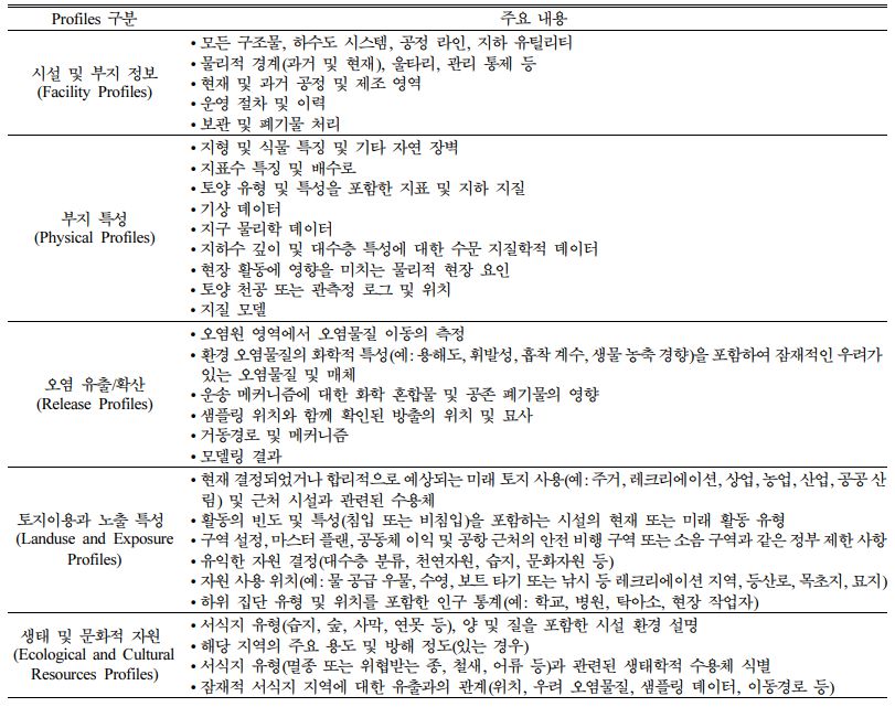오염의 시작 지점인 오염원과, 최종적인 오염 위해성의 대상이 되는 수용체, 그리고 그 사이에 지중환경에서 발생하는 거동경로상 오염물질 반응 등의 부지개념모델에 포함되는 정보는 Profiles의 형태로 부지개념모델의 작성 과정에서 받아들인다(USACE 2012). 부지 조사 결과로 얻은 정보를 유형별로 구분하며(Table 2), 시설 및 부지 조사 결과정보 요약(Facility Profiles)은 인공적인 특징과 오염부지 부근의 잠재적 오염원을 나타내는 정보, 물리적 조사 결과(Physical Profiles)는 유출, Fate와 거동, 접근성에 영향을 미치는 자연적인 요인, 오염 유출/확산 조사 결과(Release Profiles)는 오염물질의 이동과 범위, 토지이용과 노출 조사 결과(Landuse and Exposure Profiles)는 가능한 노출 시나리오, 수용체, 수용체 위치 등을 식별하고 평가하는 데 필요한 정보, 생태 및 문화적 자원 조사 결과(Ecological and Cultural Resources Profiles)는 현장 부근의 자연적 서식지나 생태계 수용체 정보를 포함한다.