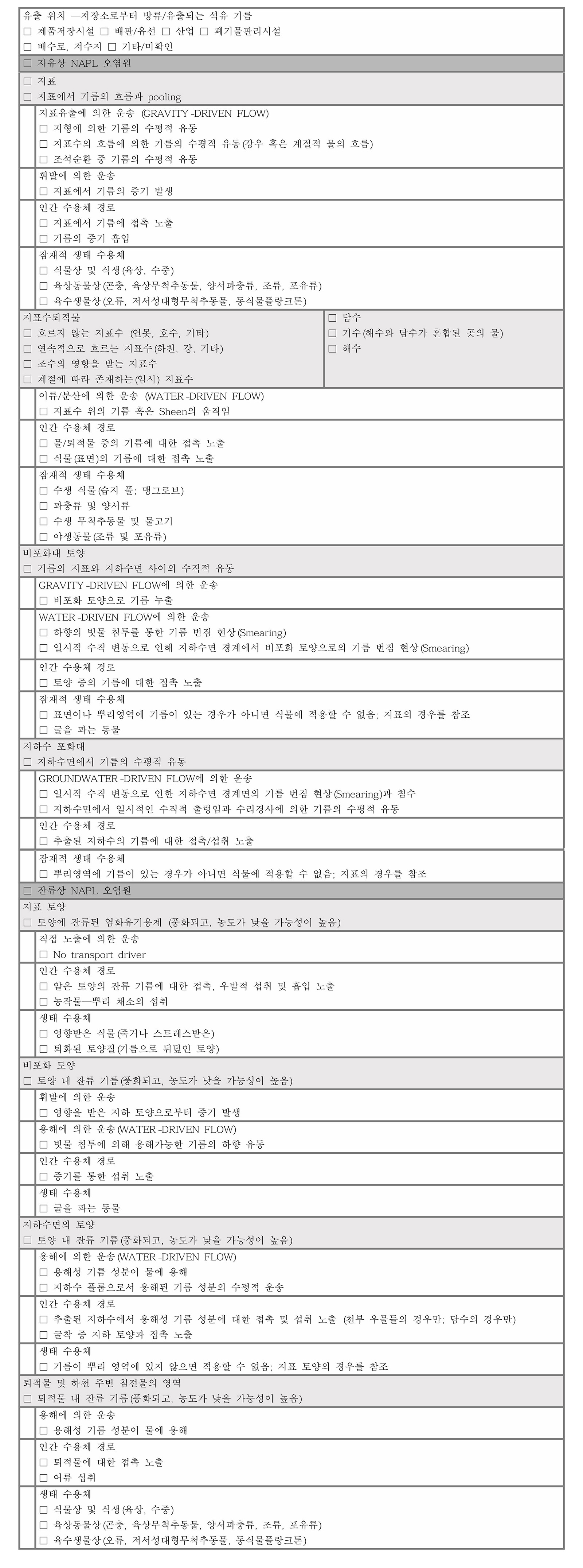 부지개념모델을 정의하는 구성 요소인 오염원, 거동경로, 수용체에 대한 조사 정보 요약 자료를 기반으로 주요 경로를 분석한다. Fig. 4는 LNAPL 오염부지를 대상으로 활용 가능한 부지개념모델 주요 경로 분석을 위한 ‘ITRC, TPH Risk Evaluation at Petroleum-Contaminated Sites (TPHRisk-1), 2018’의 체크리스트로, 국내 환경영향평가법의 수용체 항목을 반영하여 다음과 같이 제시하였다.