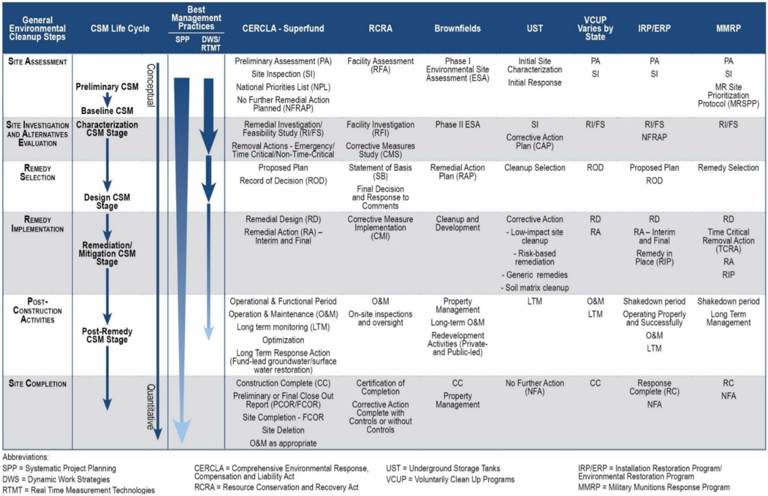 6) 관리 CSM(Post Remedy CSM): 정화 완료 후 다양한 문서화 및 재개발 계획 요구 사항을 지원할 수 있도록 통합 및 종합 정보를 제공하는 부지개념모델이다. 정화 목표를 달성하는 현장의 개선 효과와 성과를 프로그램 방식으로 평가하기 위해 통계적 기반을 가진다. 오염부지 정화 성공과 관련하여 확인된 최상의 관리 및 기술을 문서화하고 활용한다. 부지 개선 활동 문서화, 잔여 폐기물의 위치, 치수 및 농도; 제도적/공학적 통제; 지질/수문 지질학적 부지 조건과 주요 부지의 물리적 또는 화학적 특징에 대한 자세한 이해를 제공하여 부지 재사용 계획을 용이하게 한다.