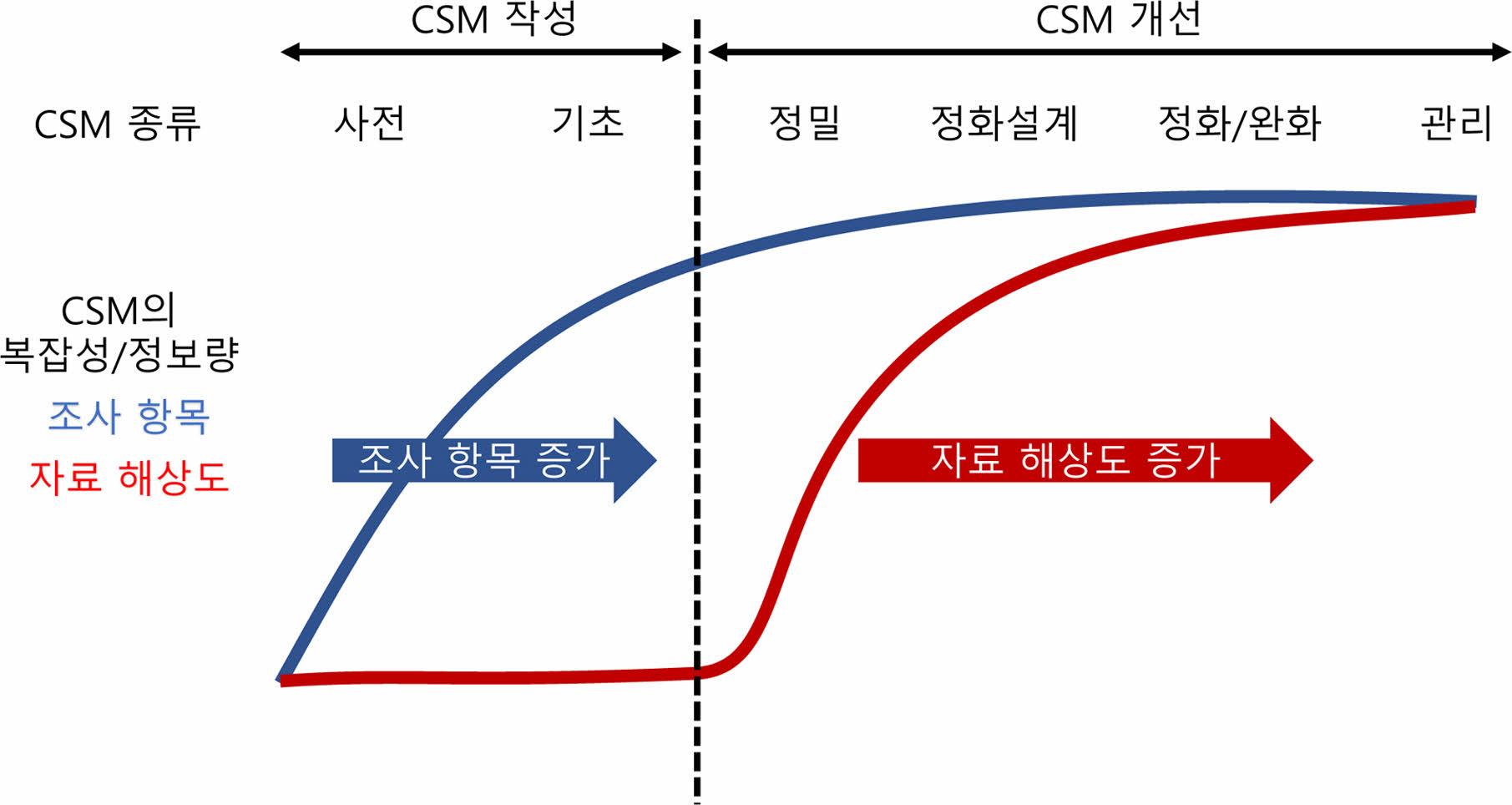 부지개념모델은 Fig. 6과 같이 1) 조사 항목을 증가하여 부지개념모델을 작성/개선하는 단계와, 2) 자료 해상도를 증가시켜 부지개념모델을 개선하는 단계로 구분할 수 있다. 조사 항목을 증가하며 작성/개선하는 부지개념모델의 경우, 작성 및 활용 초기 단계에 해당하는 사전 CSM과 기초 CSM이 있다. 자료 해상도 보충 방식의 부지개념모델 개선은 기존의 조사 항목에 해당하는 결과 내에서 향상된 정확도, 정밀도 등의 데이터 품질을 업데이트하는 방식으로 CSM을 개선하며, 개황 CSM, 정밀 CSM, 정화/완화 CSM, 관리 CSM이 있다.