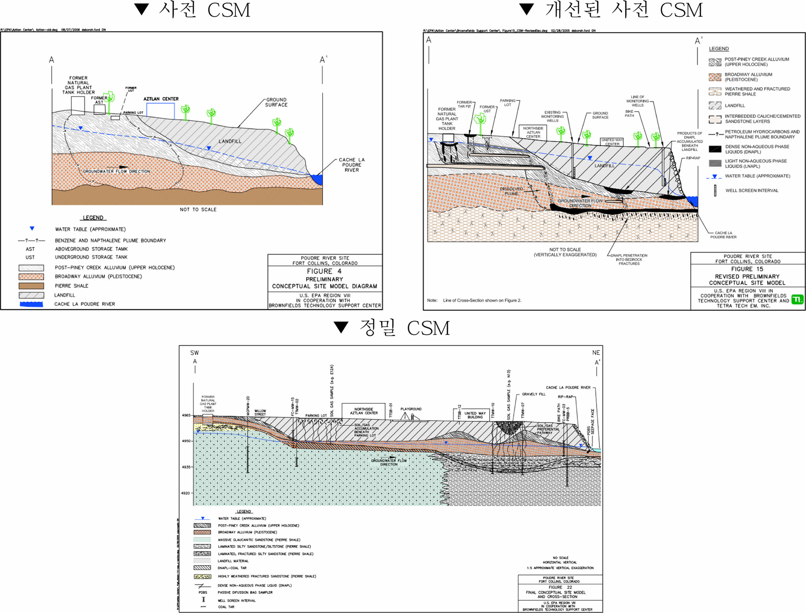 1) 사전 CSM(Preliminary CSM): 부지의 전반적인 검토를 위해 기존의 정보를 엮는 시작점이 되는 부지개념모델이다. 기존 정보 양에 따라 사전 CSM의 복잡성이 결정되는데, 주로 부지 소지자와 이해관계자 인터뷰, 과거 또는 현재의(수리)지질학적 정보, 그 이외의 정보(항공 사진, 전자 환경 데이터베이스, 소유 세금 지도 등의 정보를 포함한다.