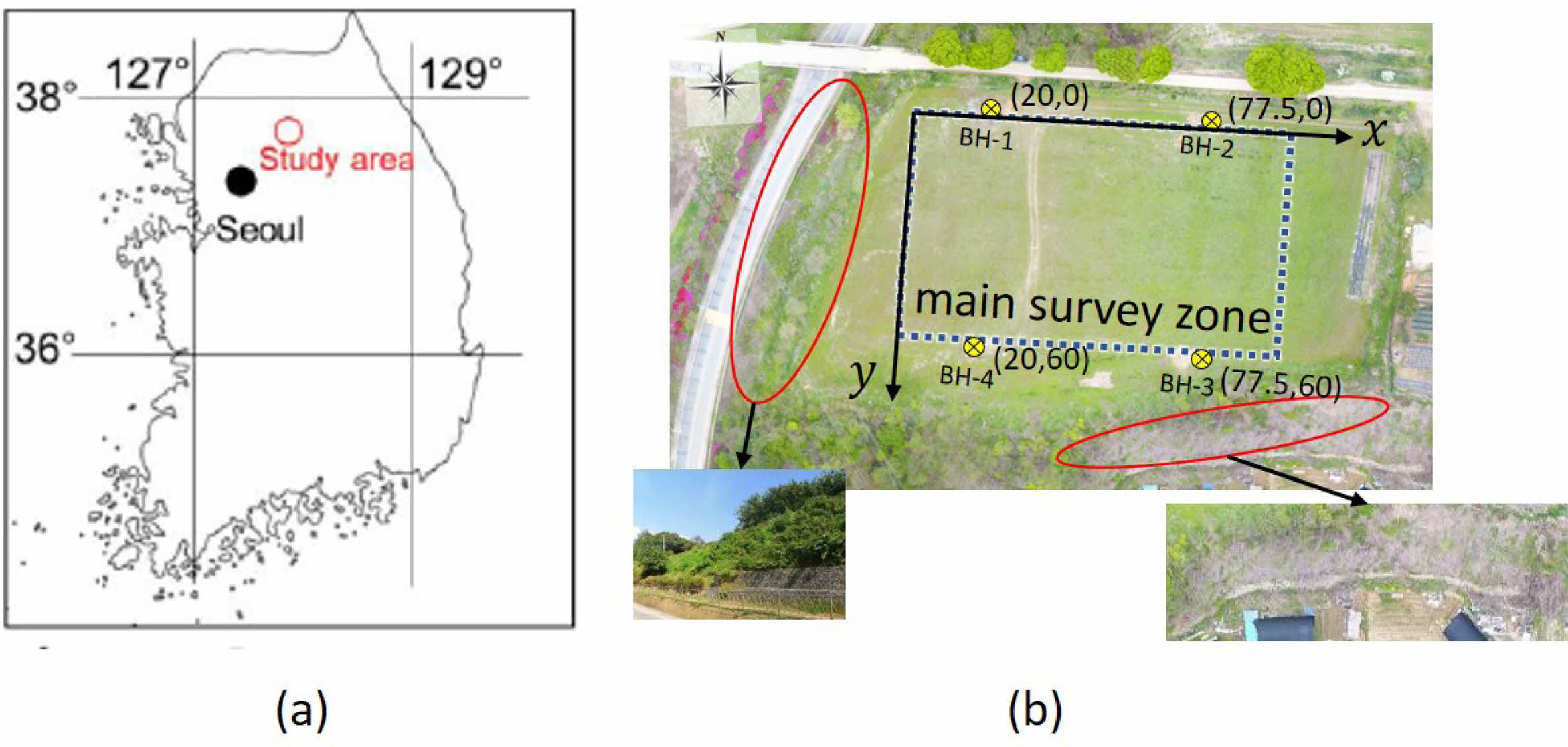 주 시험 영역은 가로 100 m 세로 60 m의 크기로 주변이 산으로 둘러싸여 있지만 비교적 지형 변화가 없는 평지이며 해발 고도 약 50 m에 위치한다. 부지 가운데에는 넓게 충적층(alluvium)의 두꺼운 풍화토가 쌓여 있다. 주 탐사 영역 서쪽 끝부분은 급격한 경사면이 있고 아래쪽은 남북을 가로지르는 도로가 있으며, 남동쪽에도 서쪽보다 더 가파른 각도의 경사면이 있다(Fig 1(b)).