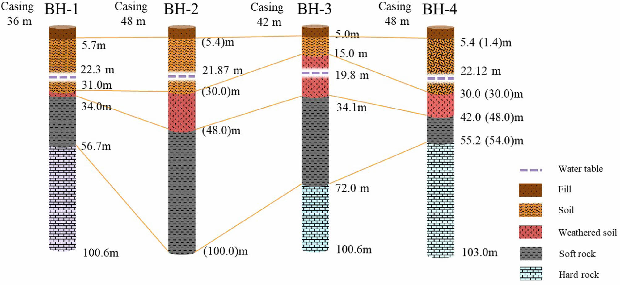 각 시추공에서 지질 주상도(core log)를 공학적으로 분류하였을 때 매립층, 붕적층, 퇴적토, 풍화토, 풍화암, 연암, 경암으로 분류할 수 있다(Fig. 2). 토양층은 지질 주상도에 매립층, 토양, 시멘트/콘크리트 등을 포함하며, 지층을 구성하는 물질들의 주요성분인 실트, 사암, 사암과 자갈층을 우세한 지층으로 분류하였다. 풍화암층은 시추공 지질 주상도에 풍화토 및 풍화암 그리고 풍화대라고 기재된 지층을 포함하였고 기반암은 암반으로 구분하였다. BH-1은 풍화암층이 가장 얇은데 비해, 풍화암층이 가장 두껍게 존재하는 BH-2는 다른 시추공과 달리 경암이 확인되지 않았고 연암은 더 깊게 위치하고 있다.