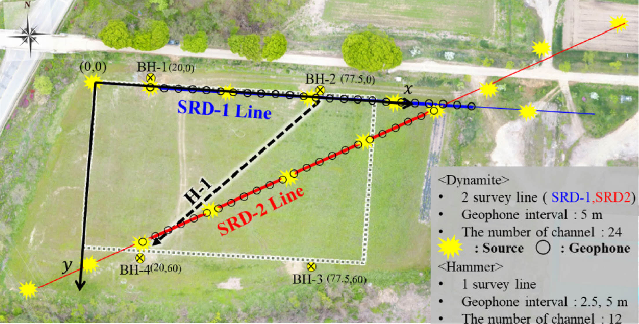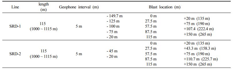 심부 기반암까지의 층서 구조 확인을 위한 다이너마이트를 이용한 탐사는 115 m 길이의 SRD-1과 SRD-2 두 측선을 따라 수신기를 5 m와 10 m 간격으로 하여 두 번씩 수행하였고, 다이너마이트는 심도 2 m에서 약 30 m 간격(Table 2)으로 발파하였다. SRD-1은 탐사 부지의 북쪽에 BH-1과 BH-2를 따라 동-서 방향으로 14개 송신원에 대해 측정한 반면, SRD-2는 BH-2에서 BH-4로 향하는 방향으로 좀 더 넓은 범위의 실험 부지를 가로지르는 구조를 파악하고자 총 12 위치에서 송신하였다.