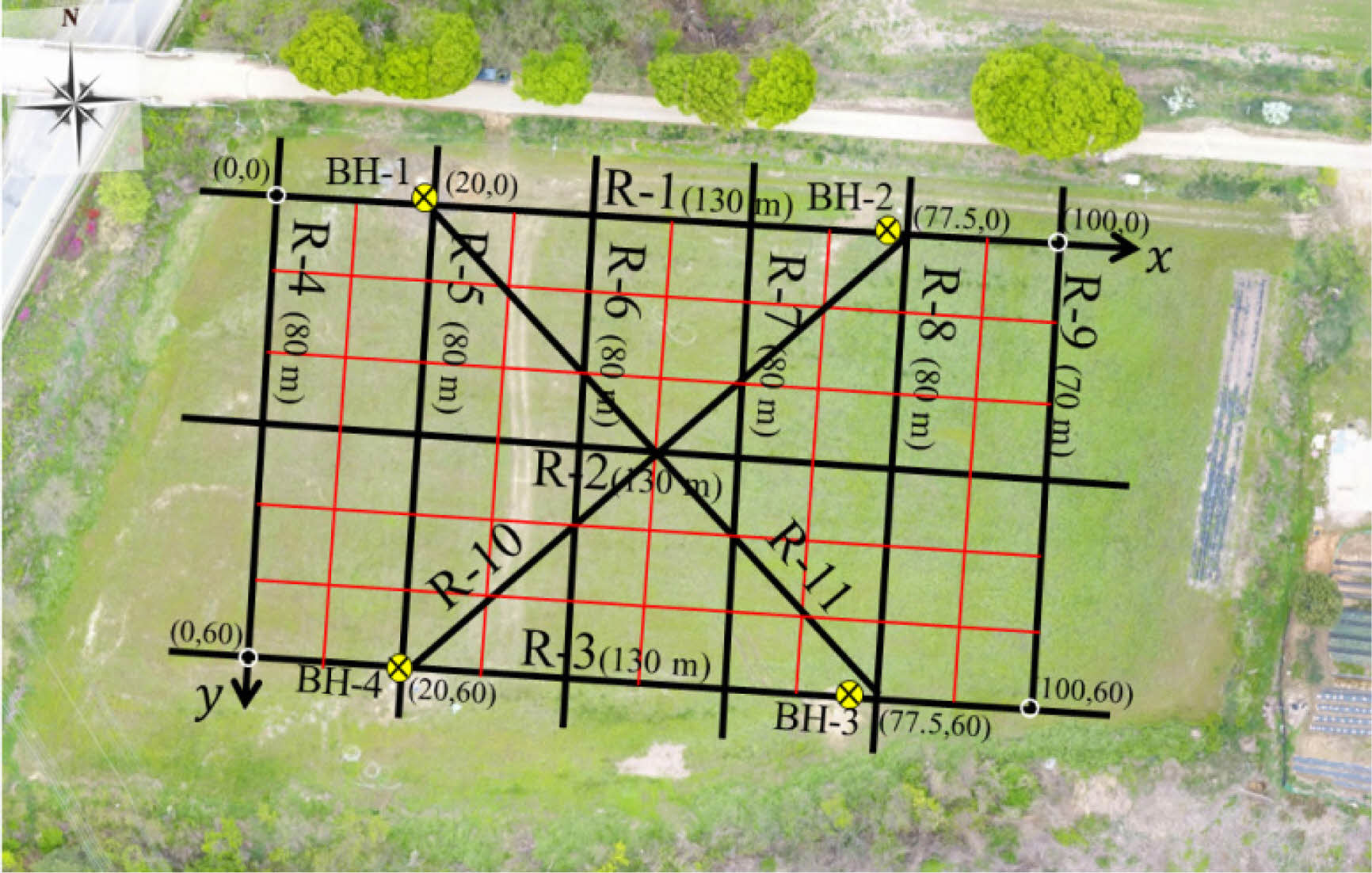 AGI사 Supersting R8을 이용하여 수행한 전기비저항 탐사는, 해당 부지의 지하수위가 약 20 m 부근인 것을 감안하여 전극 간격을 5 m와 10 m로 쌍극자-쌍극자 배열을 적용하여 탐사하였다. 측선은 4개의 시추공을 기준으로 하여 총 11개 측선(R-1 ~ R-11)에서 자료를 취득하였다(Fig. 4). 동서 방향 측선 R-1과 R-3은 각각 시추공 BH-1, BH-2와 BH-3, BH-4를 지나도록 하였고, 측선 R-2는 측선 R-1과 R-3 중간 지점에 동일한 방향에 위치시켜 각 측선들의 간격이 30 m가 되도록 하였다. 남북 방향의 측선 R-4 ~ R-9는 측선 R-1 ~ R-3에 수직한 방향으로 위치하며, 이 중 측선 R-5와 R-8은 각각 시추공 BH-1, BH-3과 BH-2, BH-4를 지나가고, 각 측선의 간격은 20 m가 되도록 설정하였다. 대각선 방향의 측선 R-10과 R-11은 각각 시추공 BH-1, BH-4와 BH-2, BH-3를 지나가도록 하였다. 측선의 길이는 주 시험부지 전체에 대한 정보를 획득하기 위해 R-1 ~ R-3은 주 시험 영역보다 양단에 15 m 씩 연장하여 130 m, R-4 ~ R-8도 주 시험 영역보다 10 m 씩 연장하여 80 m 씩 탐사하였다. 하지만 측선 R-9의 경우 남쪽에 경사 지형으로 인해 북쪽으로만 연장하여 70 m 길이로 탐사하였다.