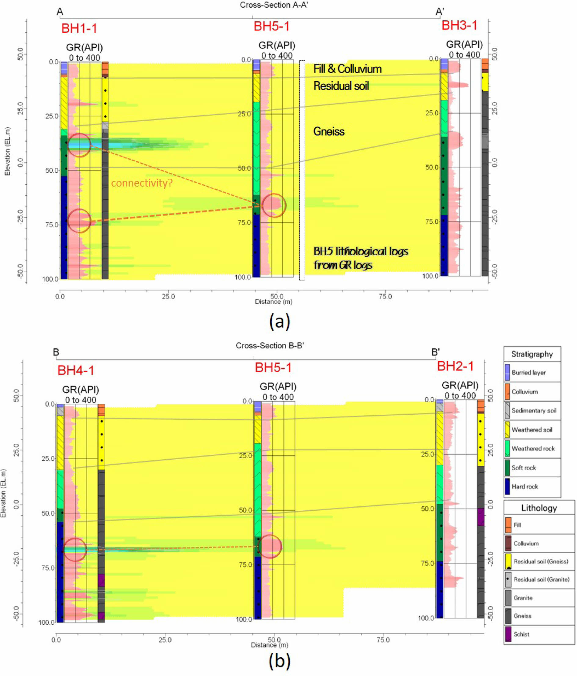 Fig. 5 Geological cross-section based on the natural gamma ray log: (a) BH-1, BH-5, and BH-3; (b) BH-4, BH-5, and BH-2 (Shin et al., 2022). |