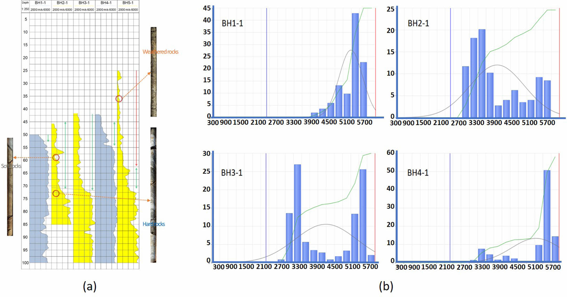 Fig. 6 P-wave velocity distribution from sonic log; (a) vertical velocity profiles; (b) velocity histogram of each borehole (modified from Shin et al., 2022). |