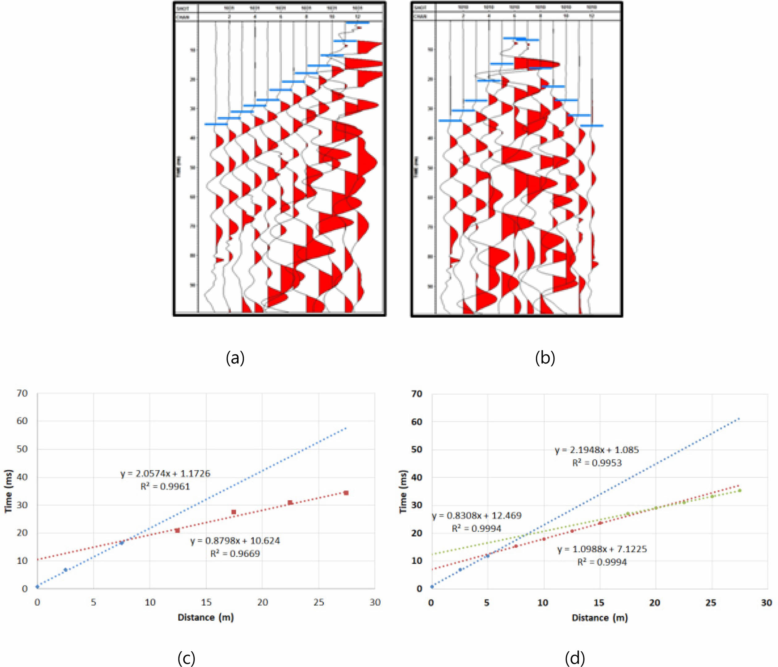 Fig. 7 Seismic refraction results of (a) 2.5 m and (b) 5 m source-receiver offset. Traveltime curves of (c) 5 m and (d) 2.5 m receiver intervals using time intercepts. |