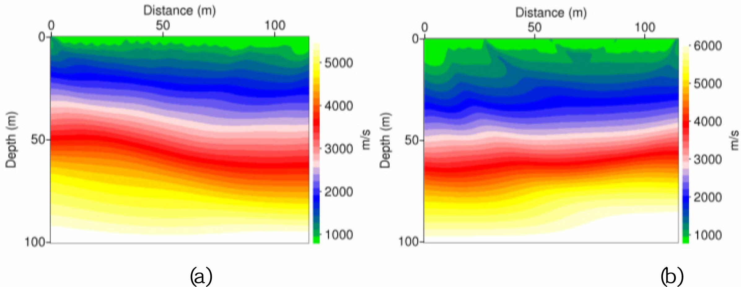 역산 결과에서 SRD-1 역산 단면에서는 수평 거리 0 m에서 115 m로 갈수록 속도가 점차 낮아지는 형태를 보이는 반면(Fig. 8(a)), SRD-2 역산 단면에서는 그 반대로 0 m에서 115 m로 갈수록 속도가 낮아지는 형태를 보인다(Fig. 8(b)). 또한 SRD-1에 비해서는 다소 평탄하게 나타났다.