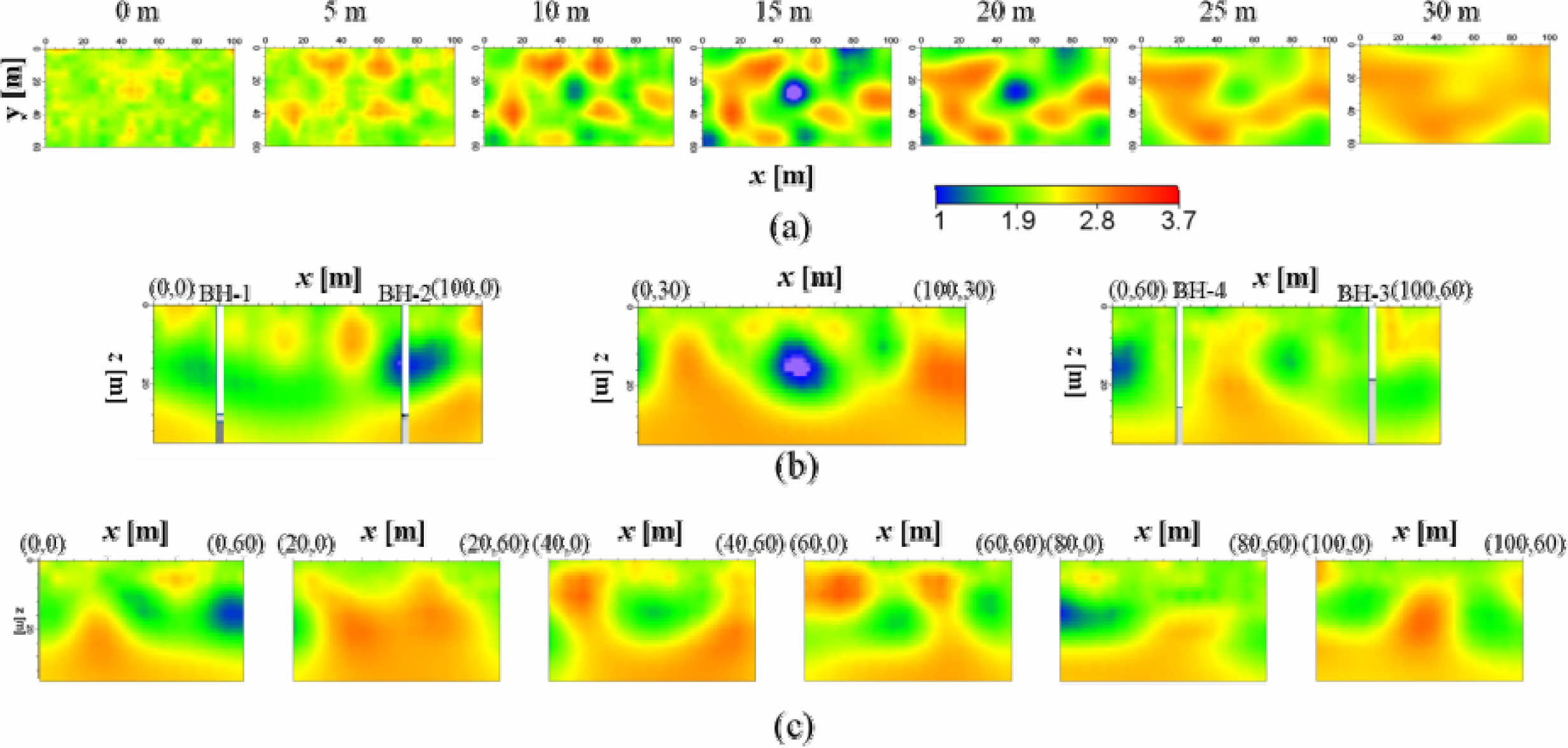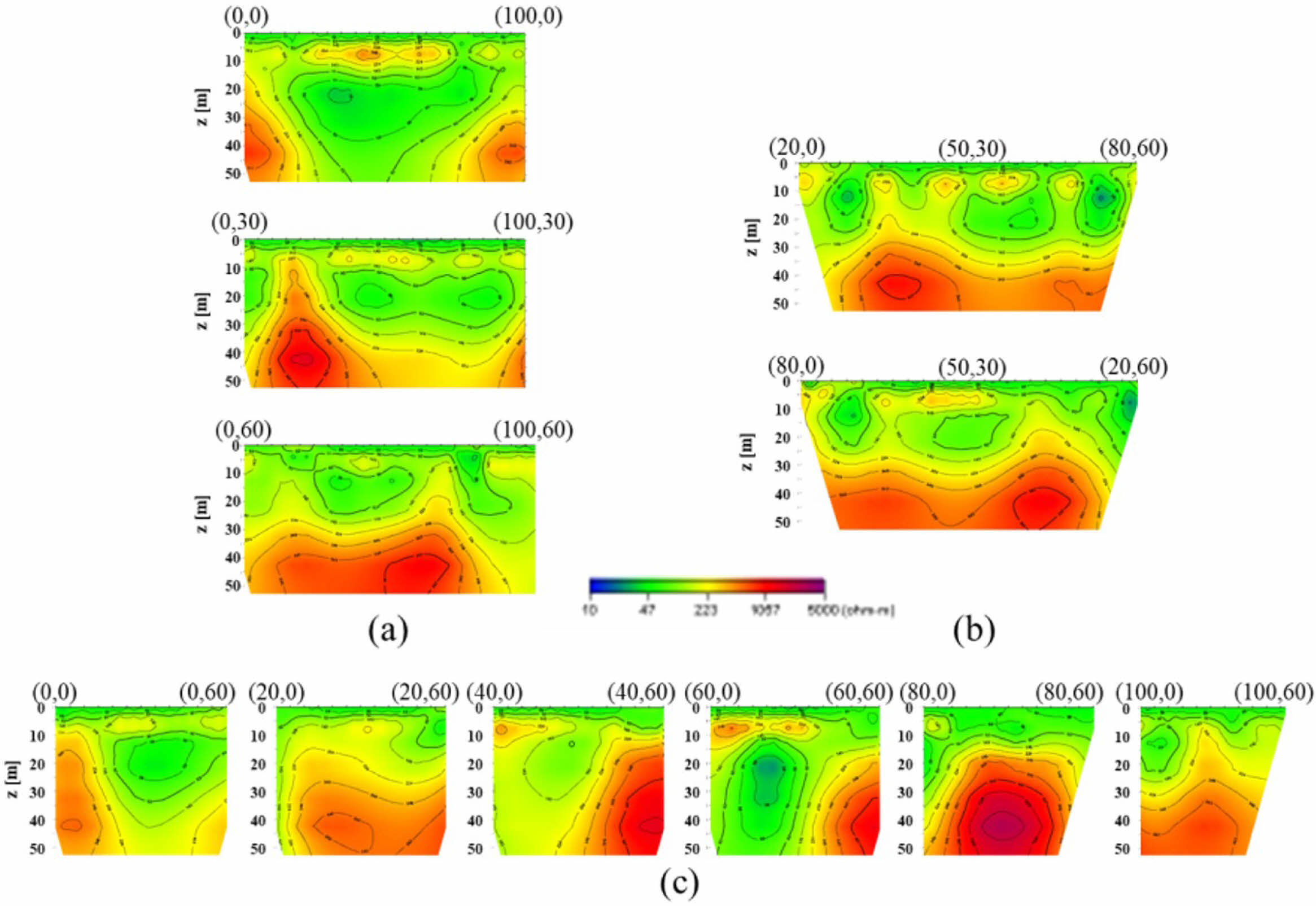 Fig. 11 3D ERT inversion results: (a) xy-depth slice, (b) xz-slice and (c) xz-slice of 10 m pole spacing. |
